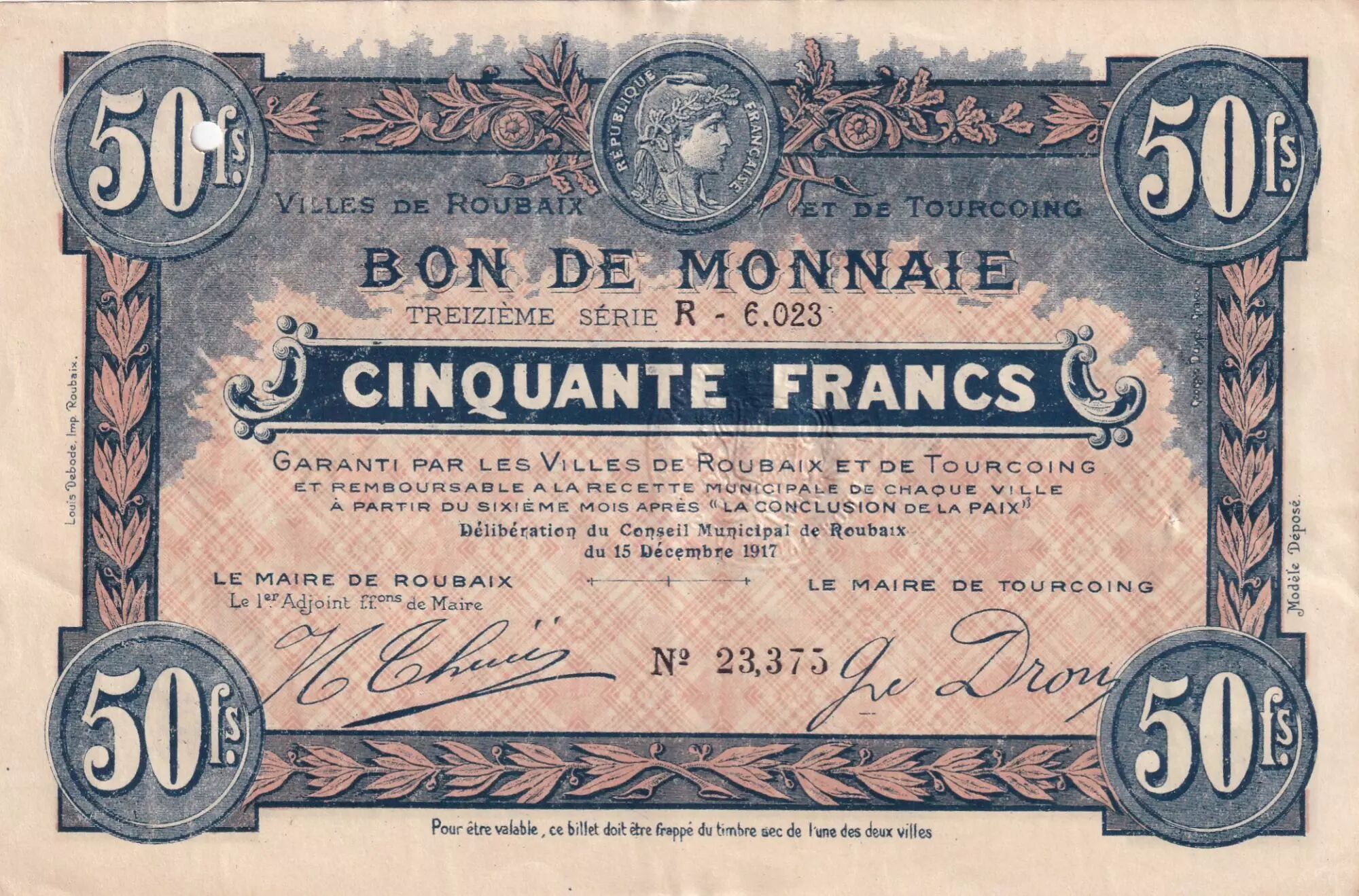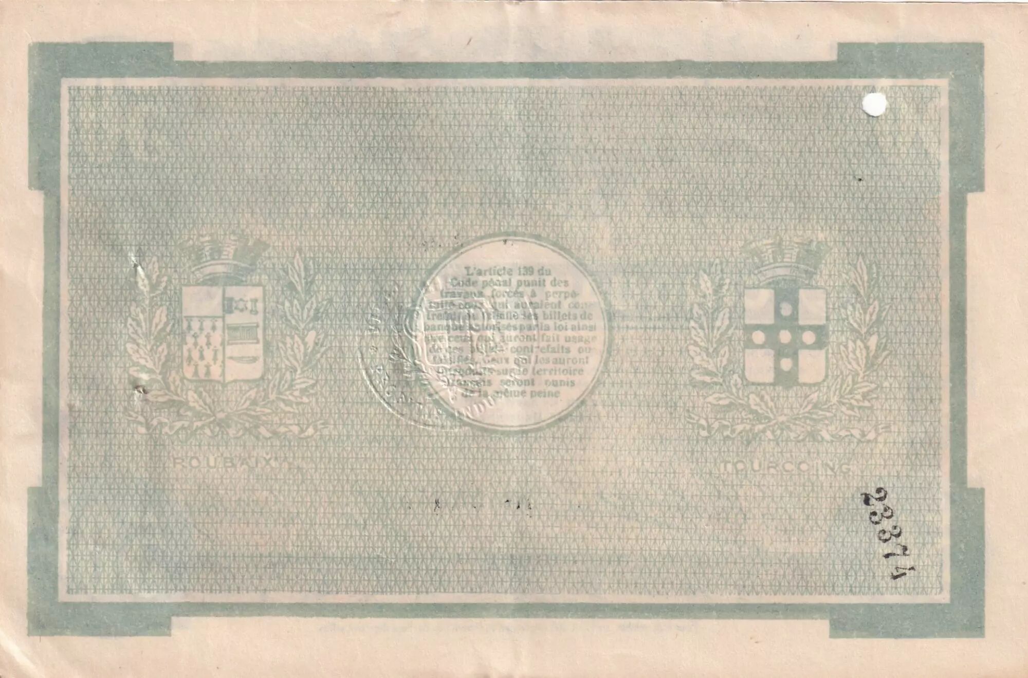 Geographically, this banknote is associated with the Nord department, and more specifically with the cities of Roubaix and Tourcoing. These two cities collaborated to issue this emergency banknote, reflecting the economic and logistical challenges of the time.