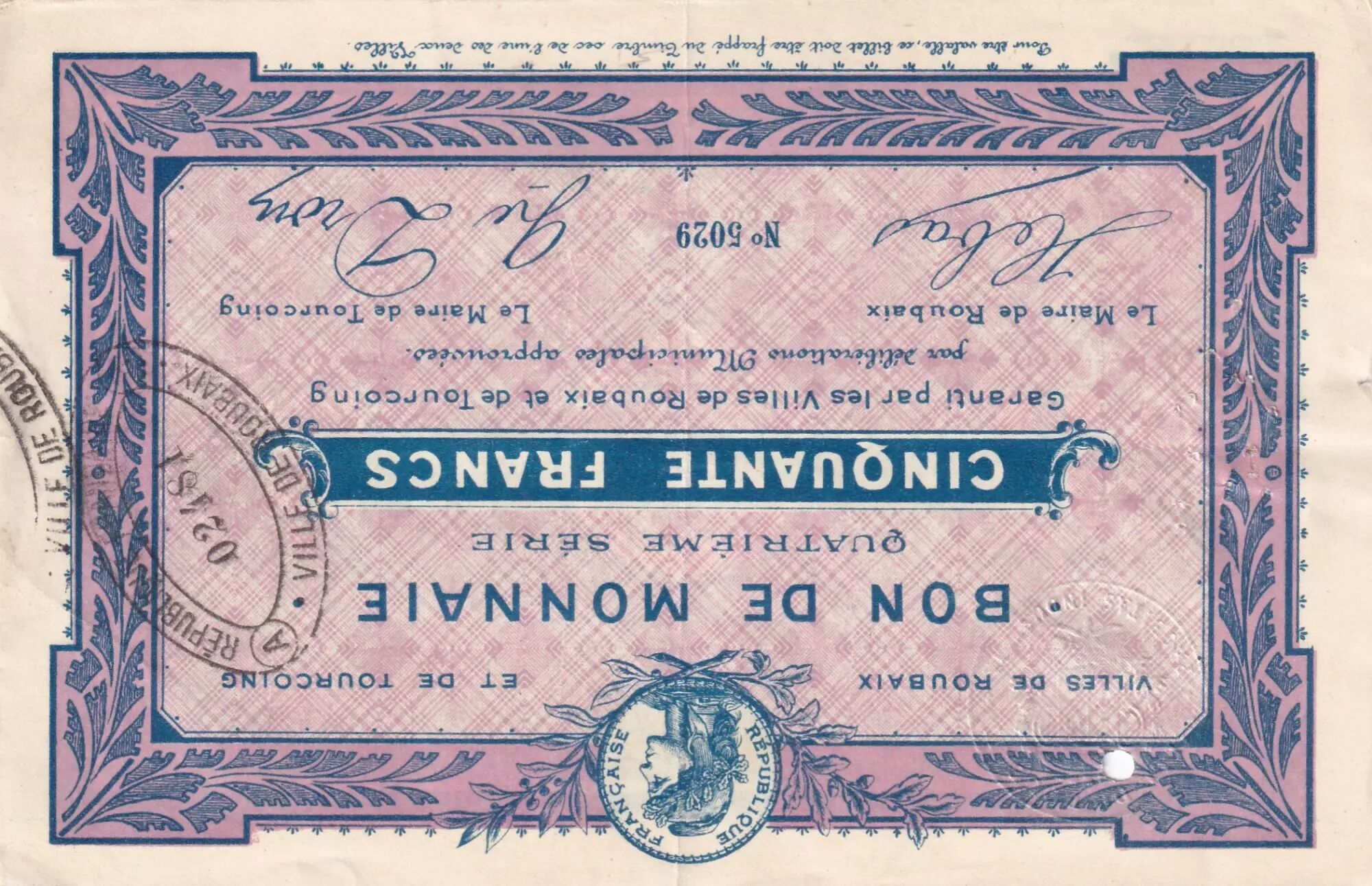 Ce billet a été émis par les villes de Roubaix et Tourcoing, situées dans le département du Nord.