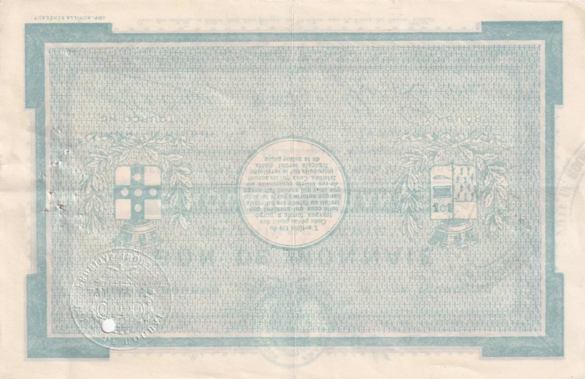 Il est important de noter que ce billet présente des traces d'annulation, matérialisées par des perforations. Ces perforations indiquent que le billet a été retiré de la circulation après avoir été utilisé.