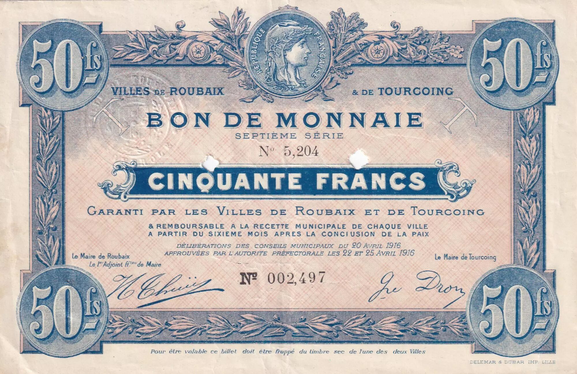 Ce billet de nécessité, d'une valeur nominale de 50 francs, a été émis en France. Il appartient à la 7ème série des émissions de nécessité de la période 1914-1918, spécifiquement aux émissions communes des villes de Roubaix et Tourcoing, situées dans le département du Nord.
