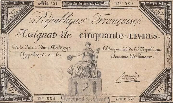 Banknote France 50 Livres - 14 December 1792 - French Republic - Sign. Barraud - Serial 321