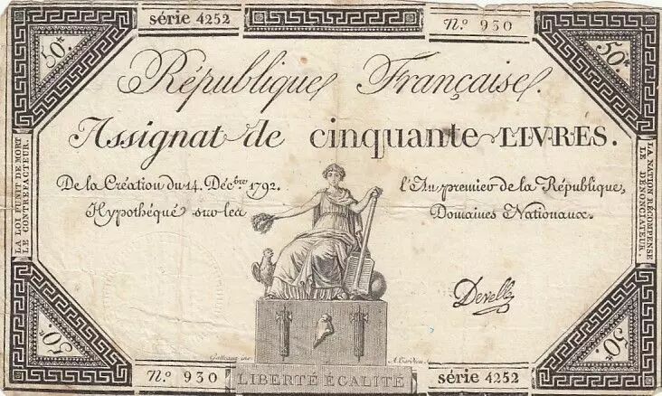 Banknote France 50 Livres - 14 December 1792 - French Republic - Sign. Develle - Serial 4252
