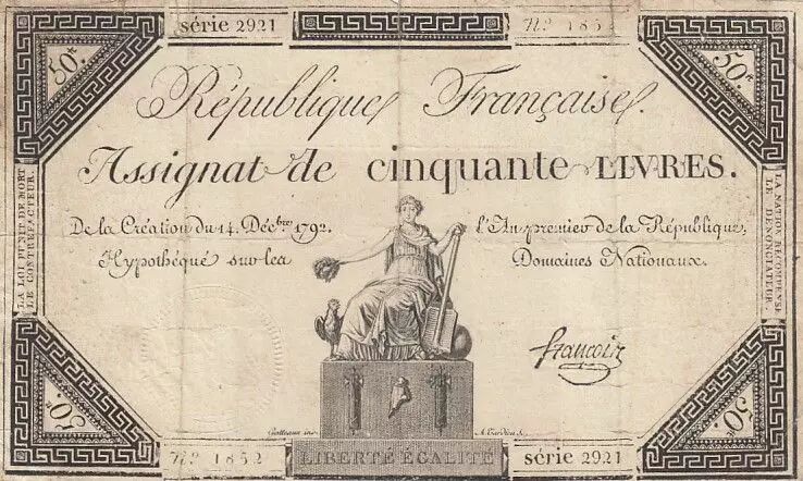 Banknote France 50 Livres - 14 December 1792 - French Republic - Sign. François - Serial 2921