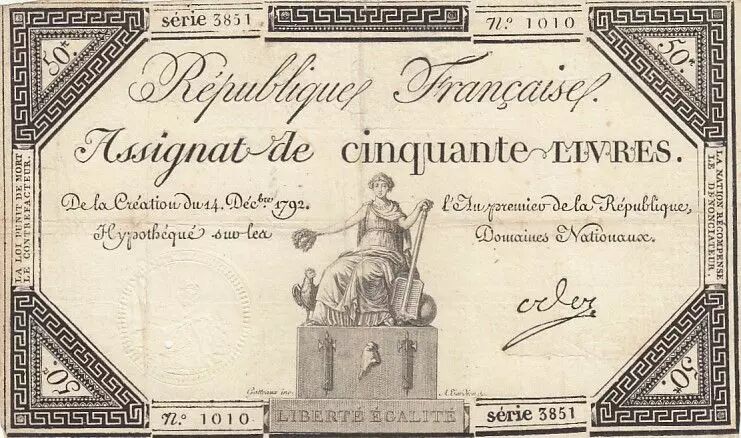 Banknote France 50 Livres - 14 December 1792 - French Republic - Sign. Oder - Serial 3851
