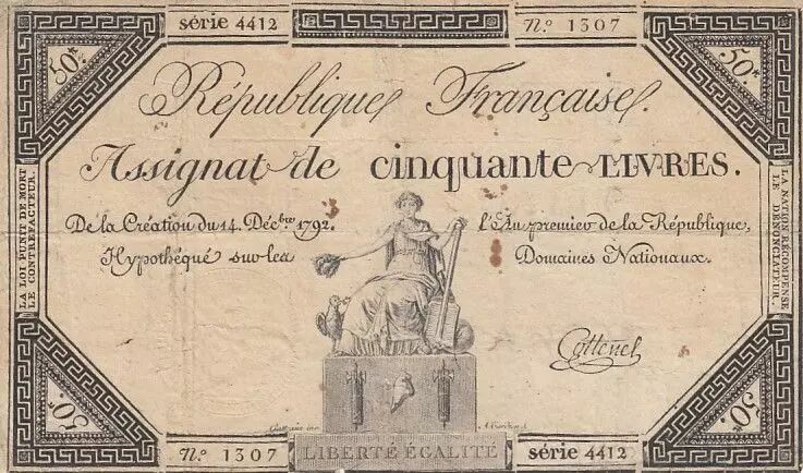 Billet France 50 Livres - 14 Décembre 1792 - République Française - Sign. Cottenel - Série 4412