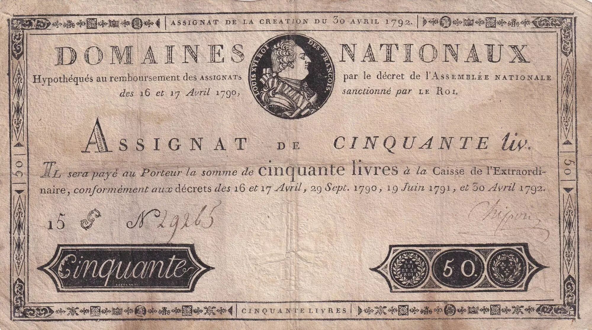 Banknote France 50 Livres Bust of Louis XVI - 30-04-1792 Serial 15 G - Sign. Chipon