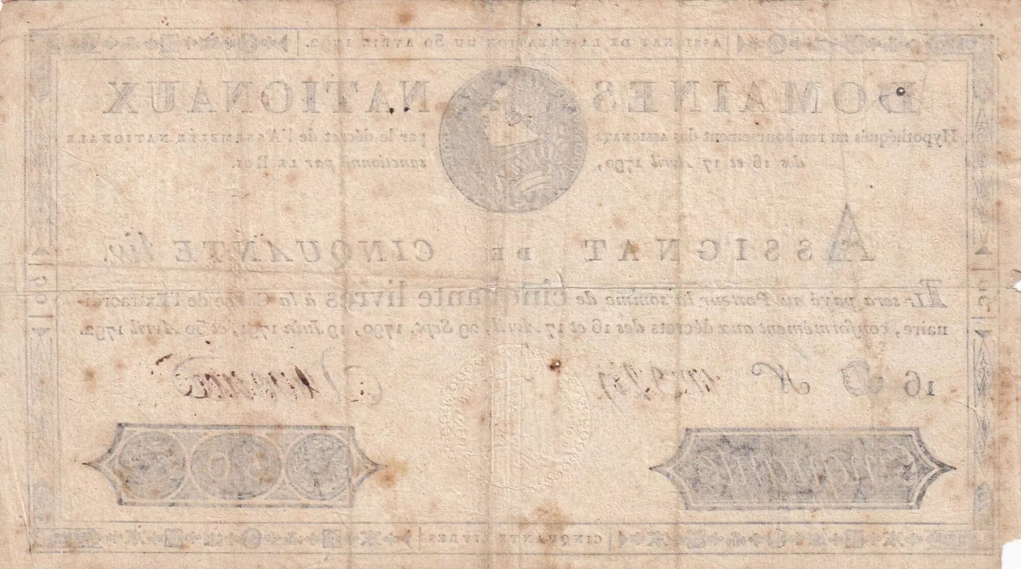 Banknote France 50 Livres Bust of Louis XVI - 30-04-1792 Serial 16 D - Sign. Ansoine