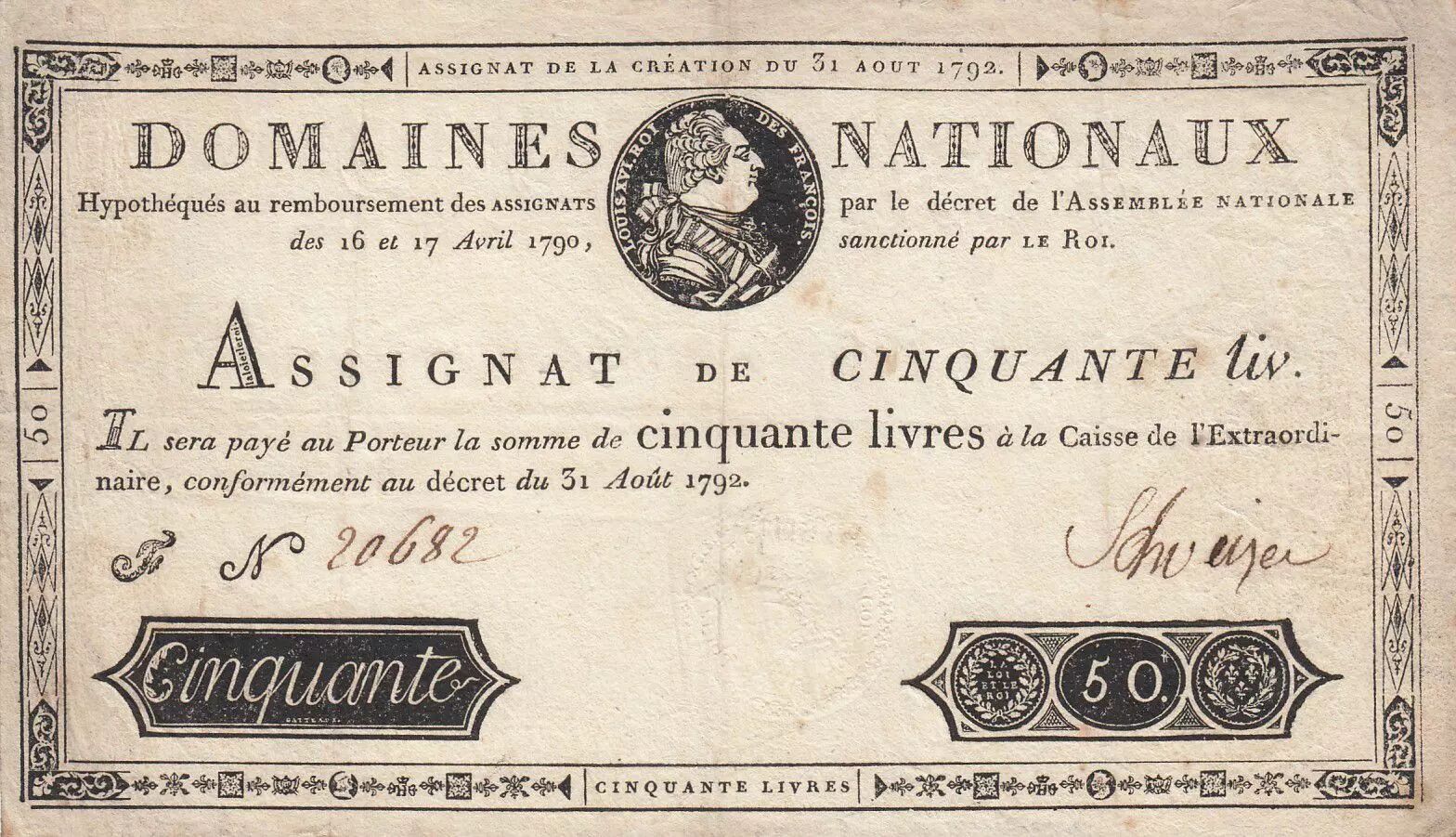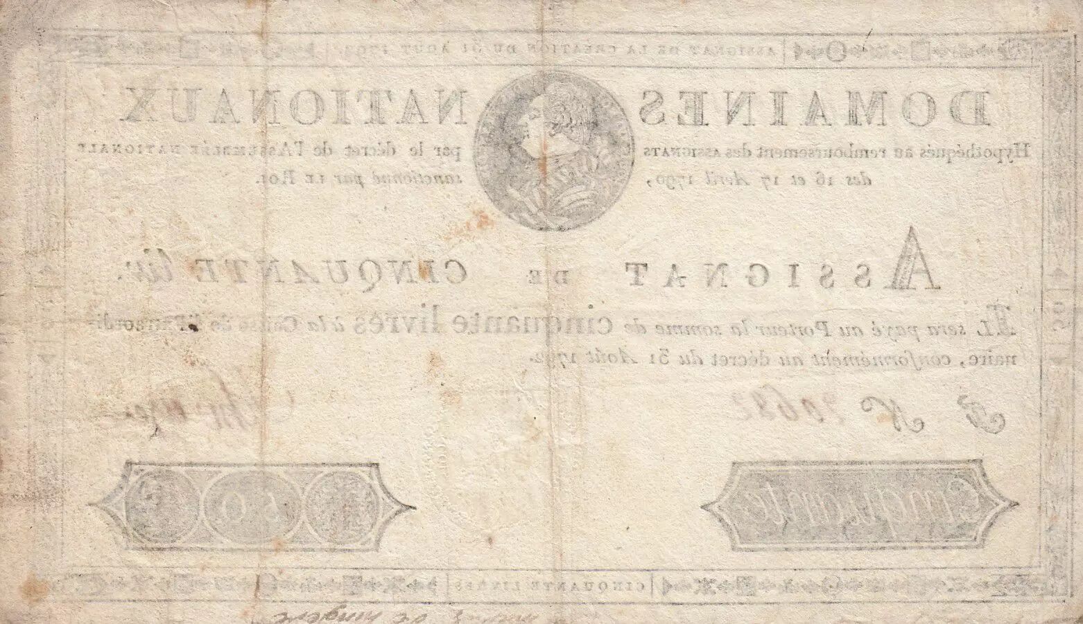 Banknote France 50 Livres Bust of Louis XVI - 31-08-1792 Serial F - VF