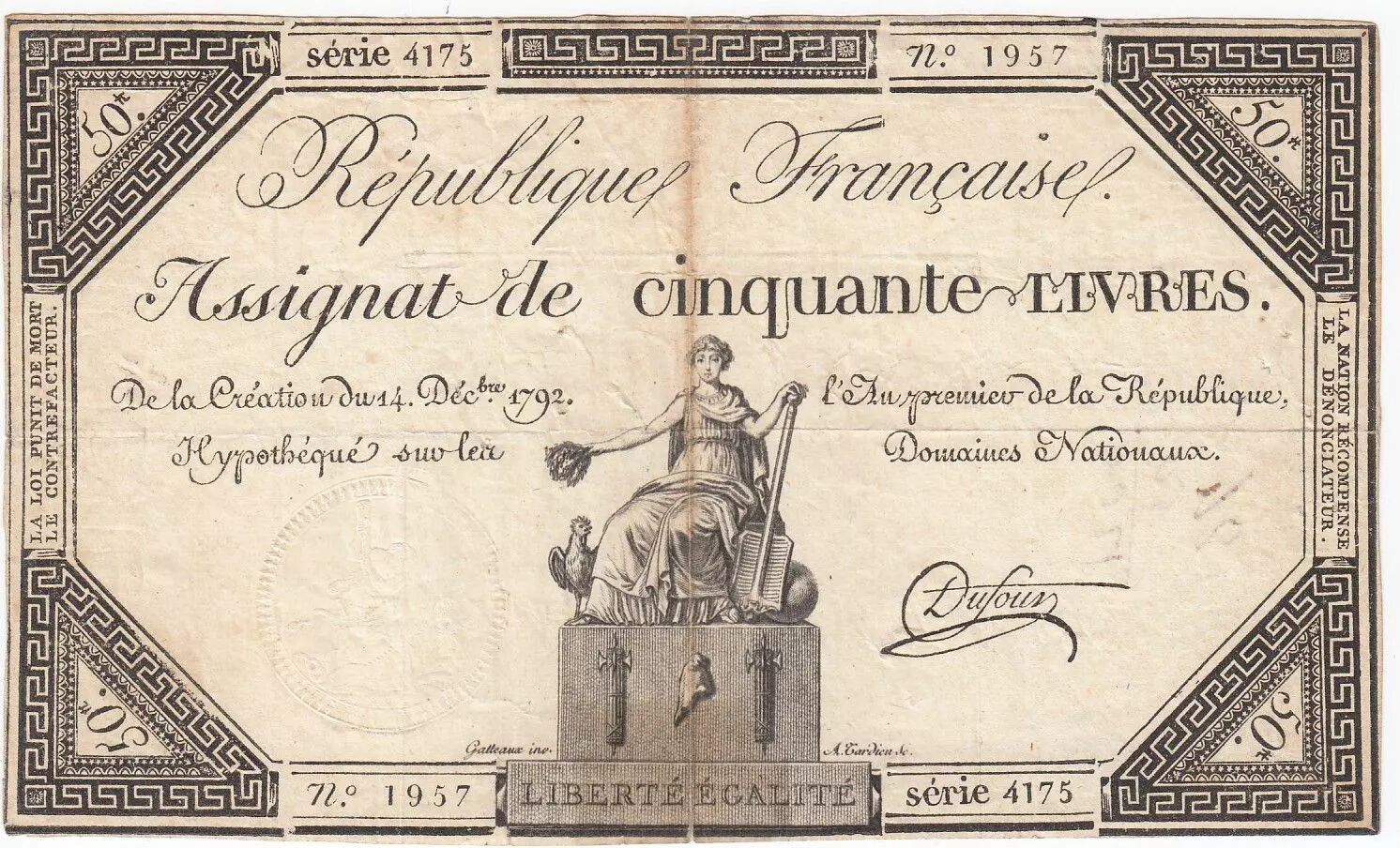 Billet France 50 Livres France assise - 14-12-1792 - Sign. Dufour - TTB