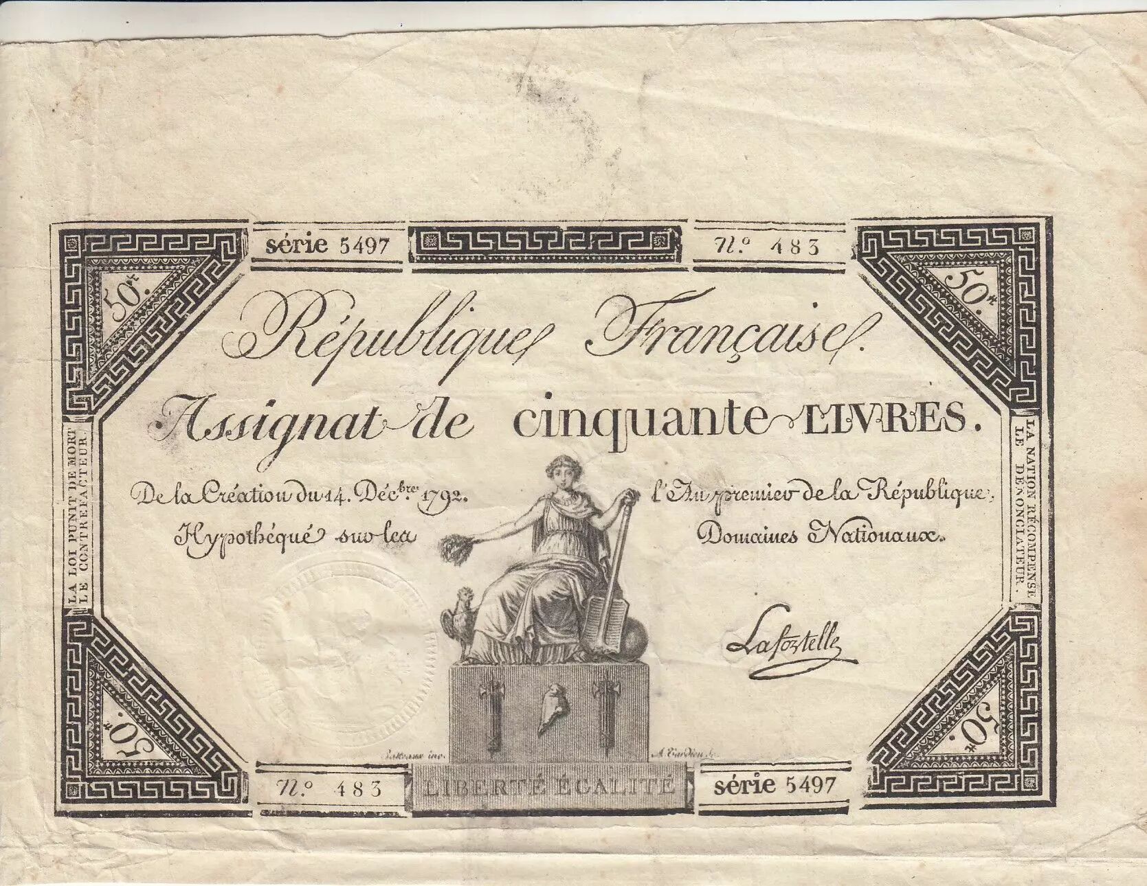 Billet France 50 Livres - France assise - 14-12-1792 - Sign. Lafortelle - Série 5497