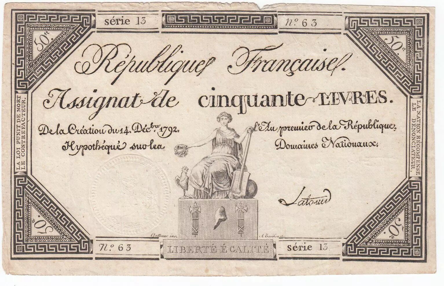 Accueil > Archivage > France 50 Livres France assise - 14-12-1792 - Sign. Latour - TTB