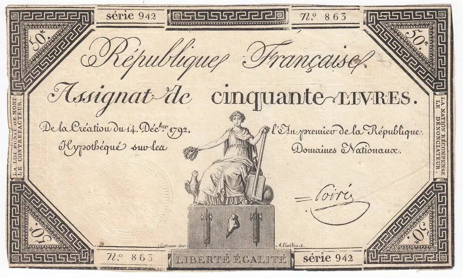 Accueil > Archivage > France 50 Livres France assise - 14-12-1792 - Sign. Poiré - TTB