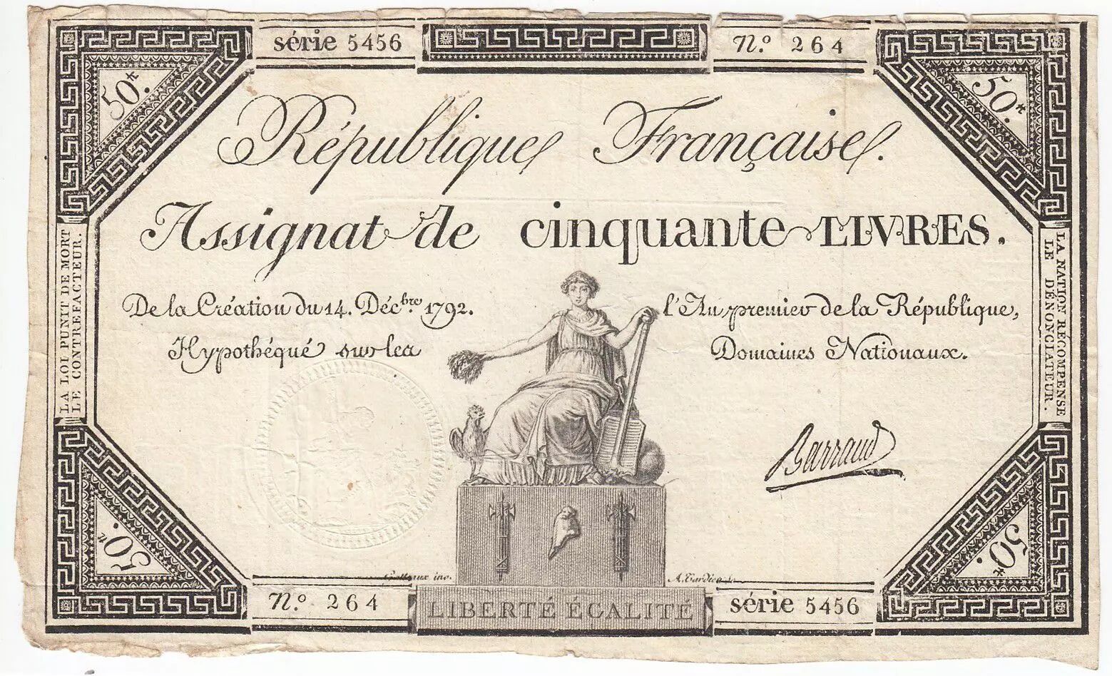 Banknote France 50 Livres France seated - 14-12-1792 - Sign. Barraud - F+