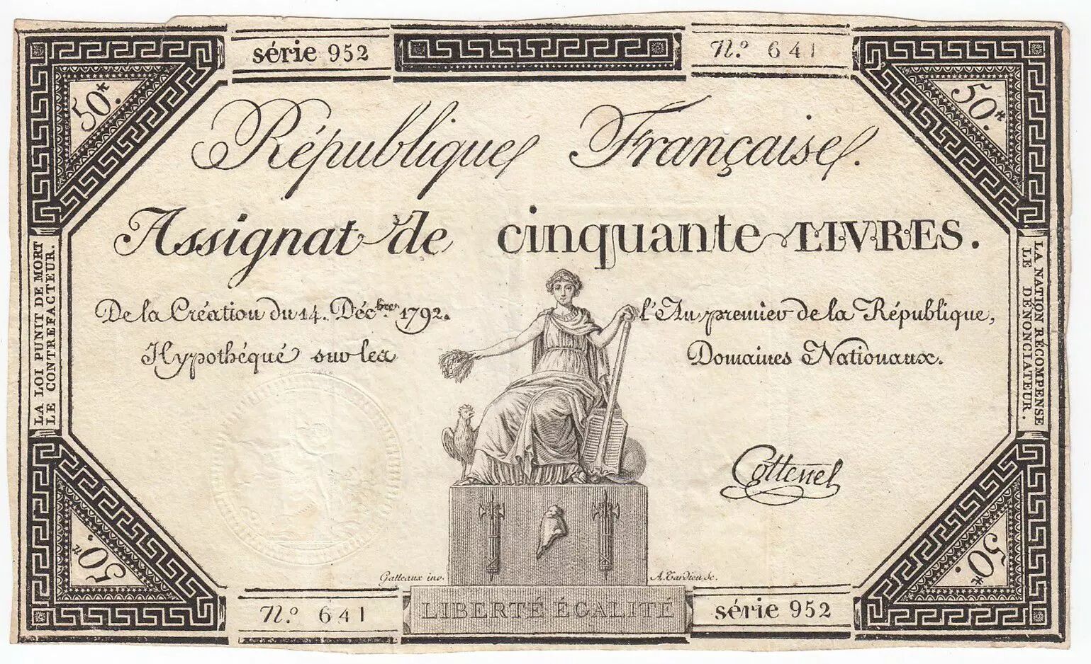 Banknote France 50 Livres France seated - 14-12-1792 - Sign. Cottenel - VF+