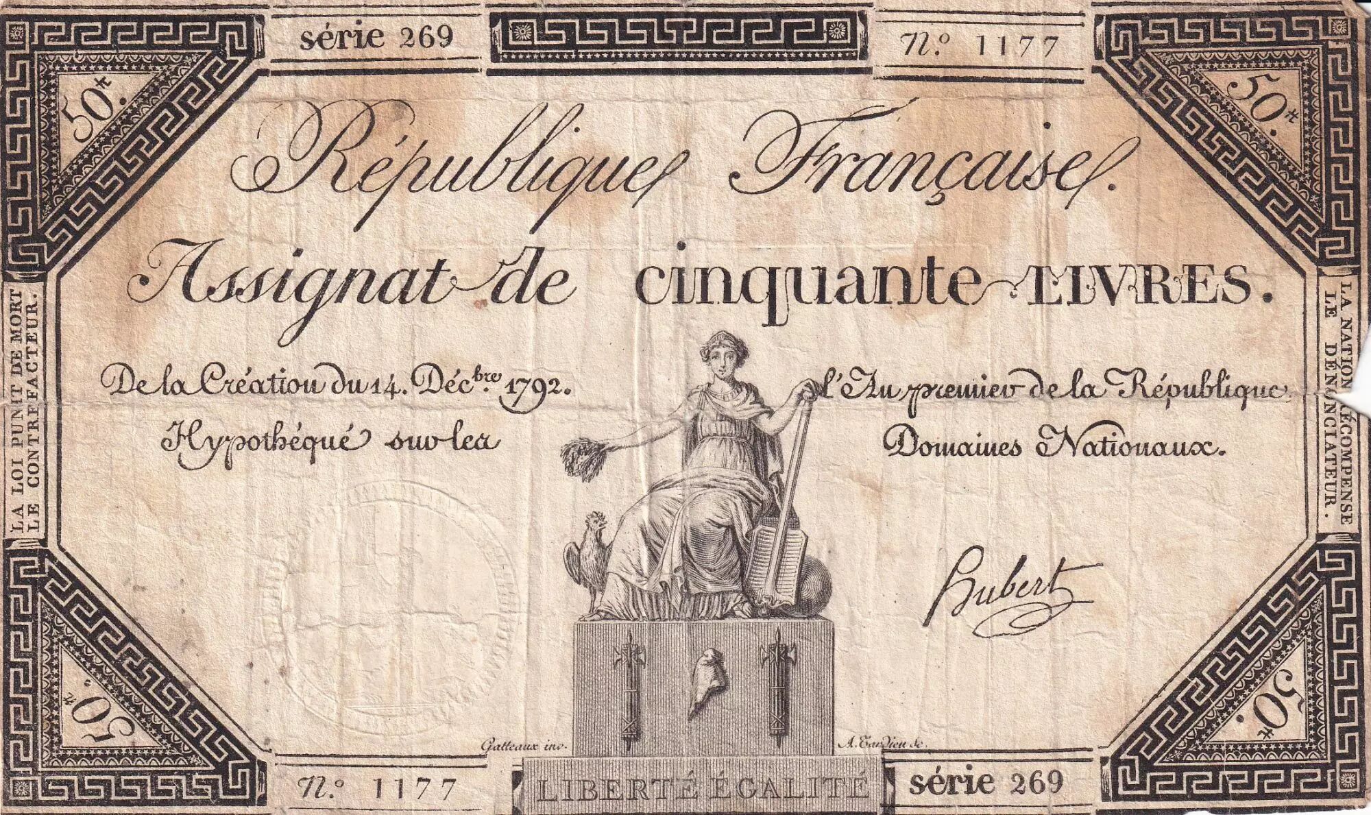 Banknote France 50 Livres - France seated - 14-12-1792 - Sign. Hubert - Serial 269 - L.164