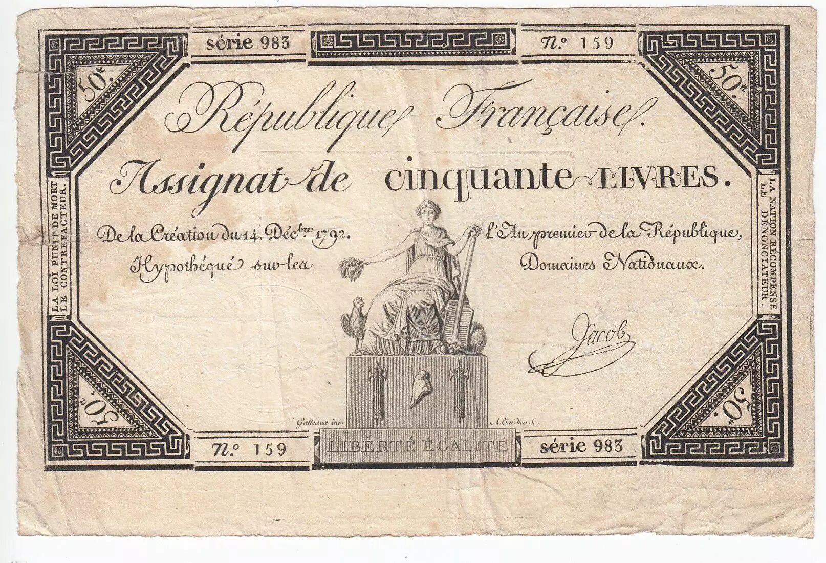 Banknote France 50 Livres France seated - 14-12-1792 - Sign. Jacob - F+