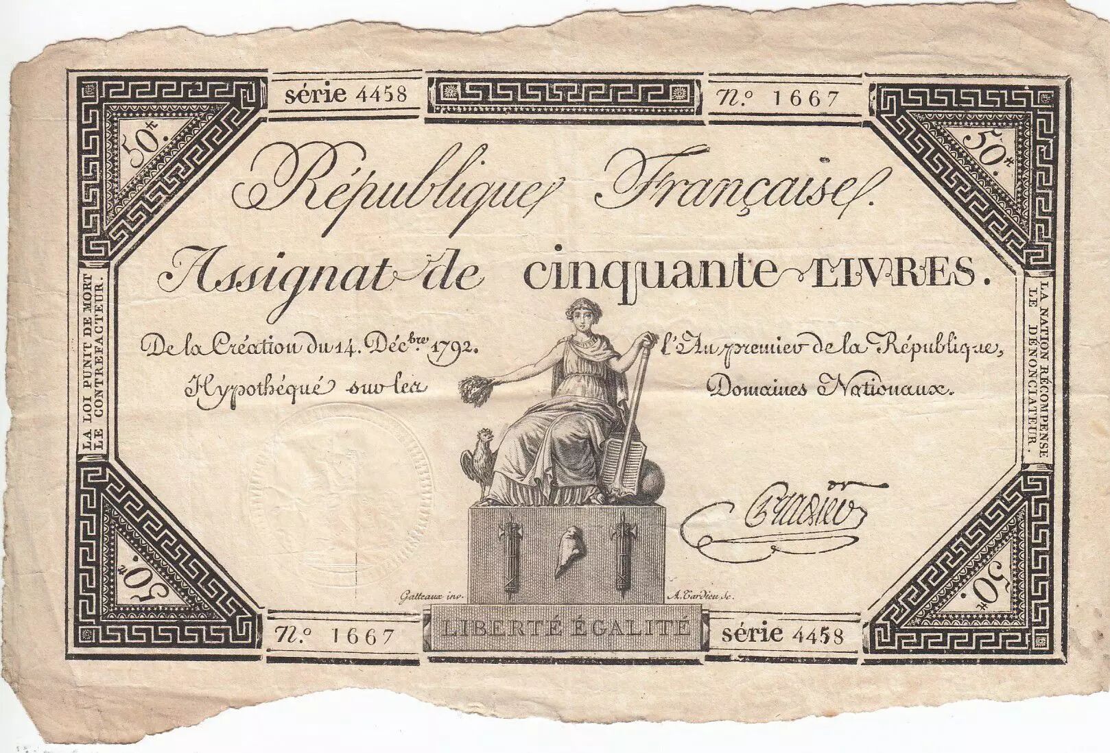Banknote France 50 Livres France seated - 14-12-1792 - Sign. Pradier - VF