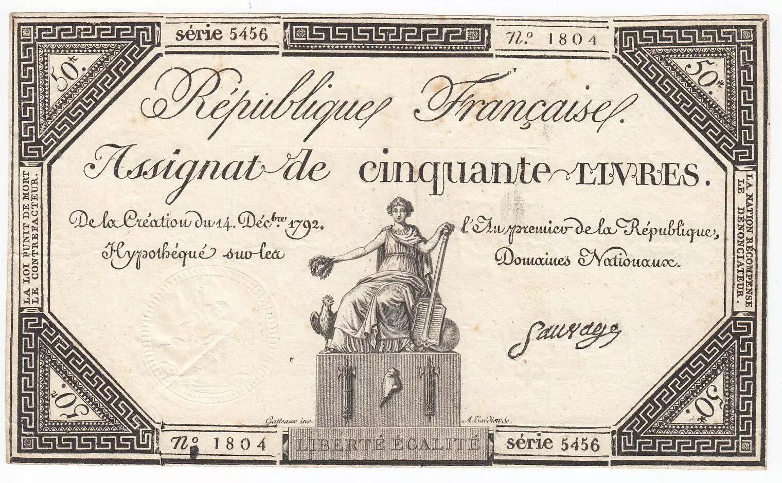 Banknote France 50 Livres France seated - 14-12-1792 - Sign. Sauvage - XF