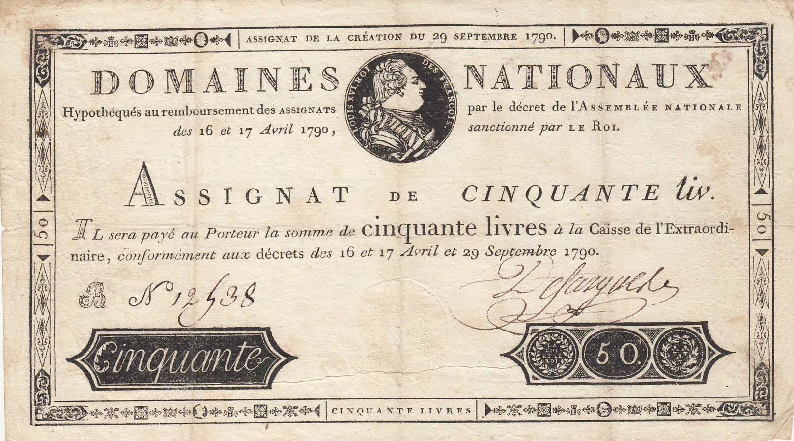 Accueil > Archivage > France 50 Livres Louis XVI - 29-09-1790 Série B - Sign. Defargues - TTB