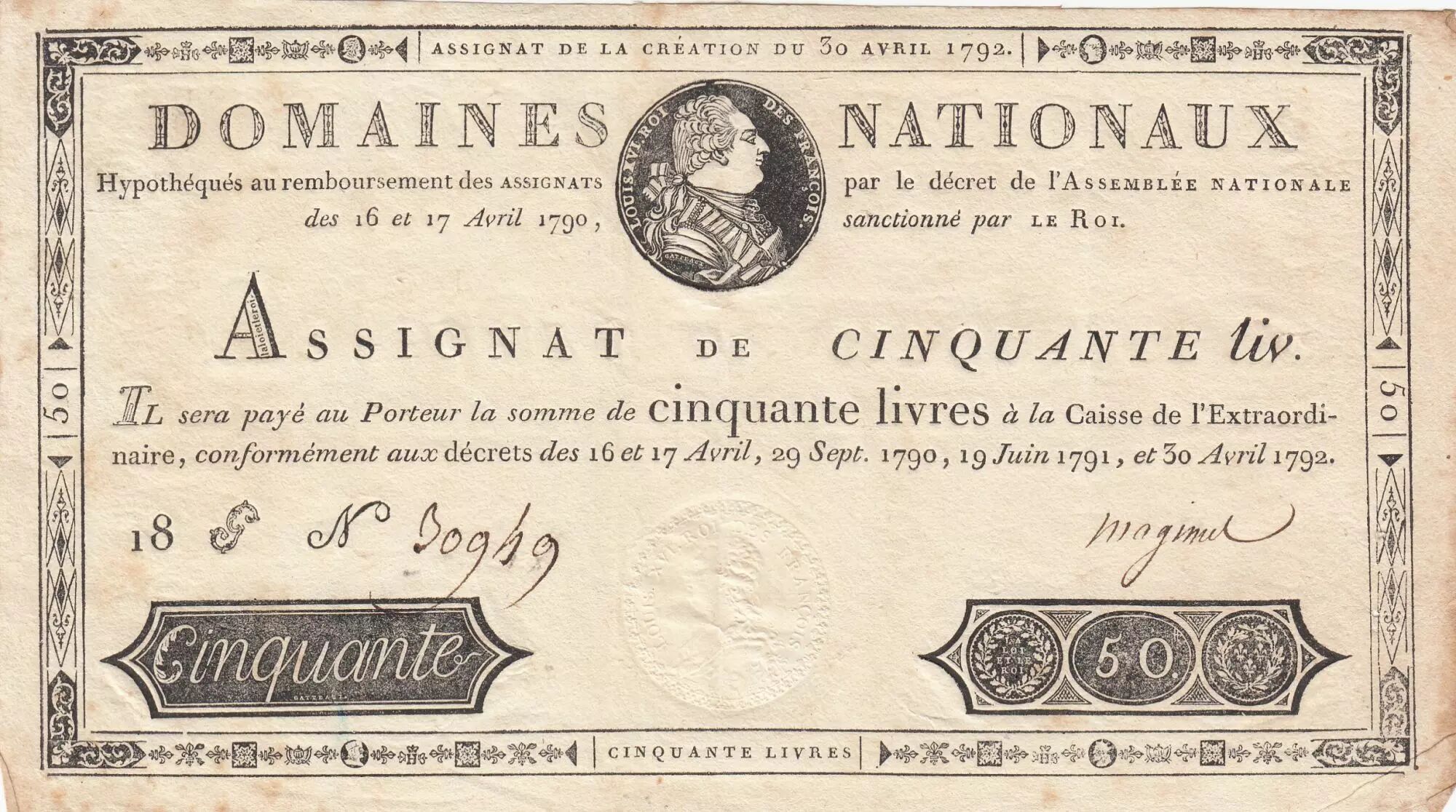 Billet France 50 Livres Louis XVI - 30-04-1792 Série 18G - Sign. Magima