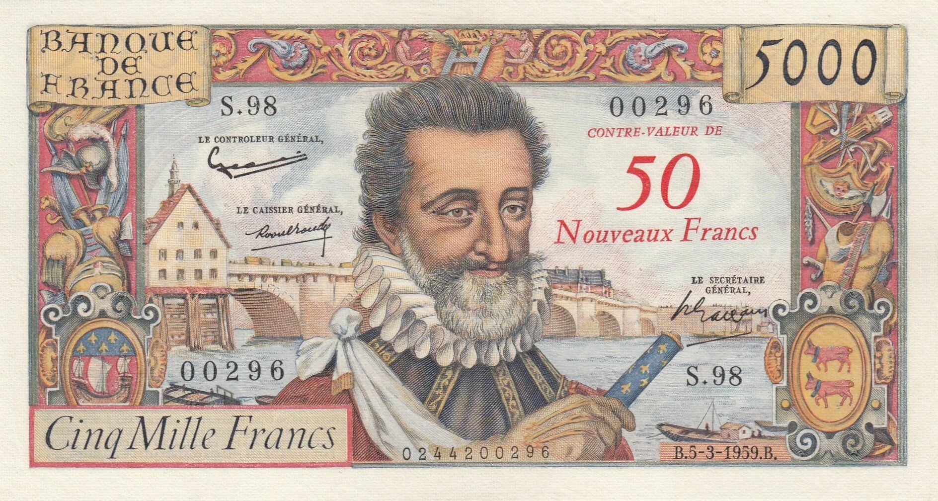 On the main face of the banknote, there is a portrait of Henry IV, recognizable by his ruff and characteristic mustache. The background features architectural and decorative elements of the time, evoking the reign of the king. The mention of the face value, "50 Nouveaux Francs", is clearly indicated, as well as the designation of the issuing institute.