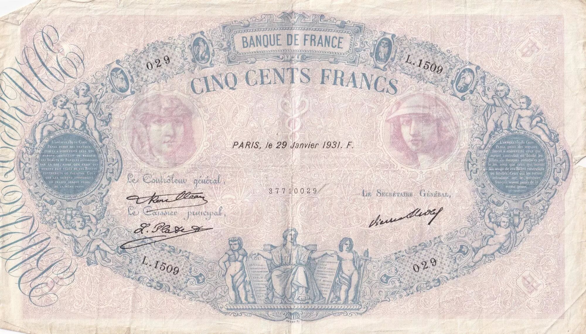 Banknote France 500 Francs Blue and Pink - 29-01-1931 - Serial L.1509