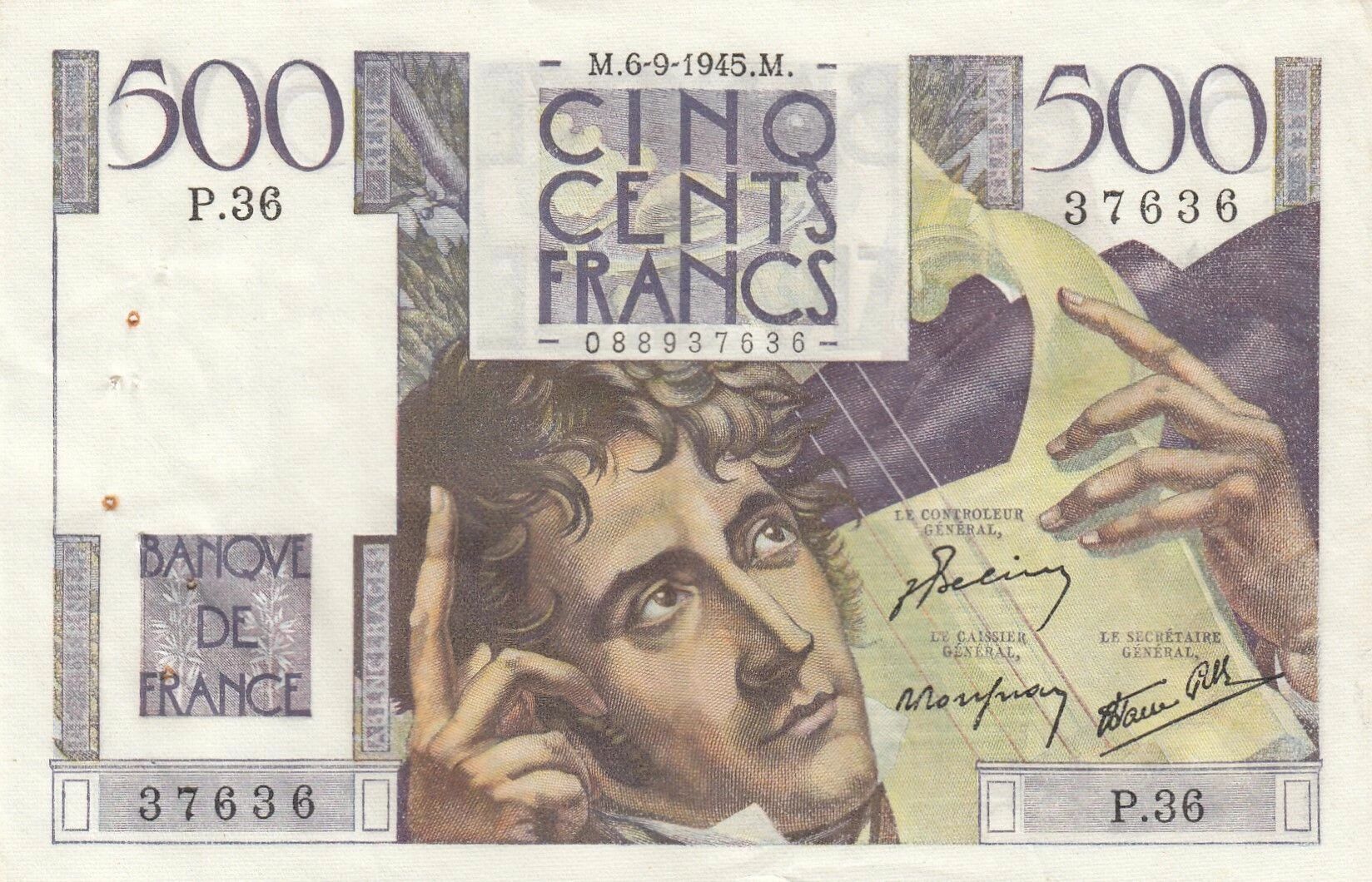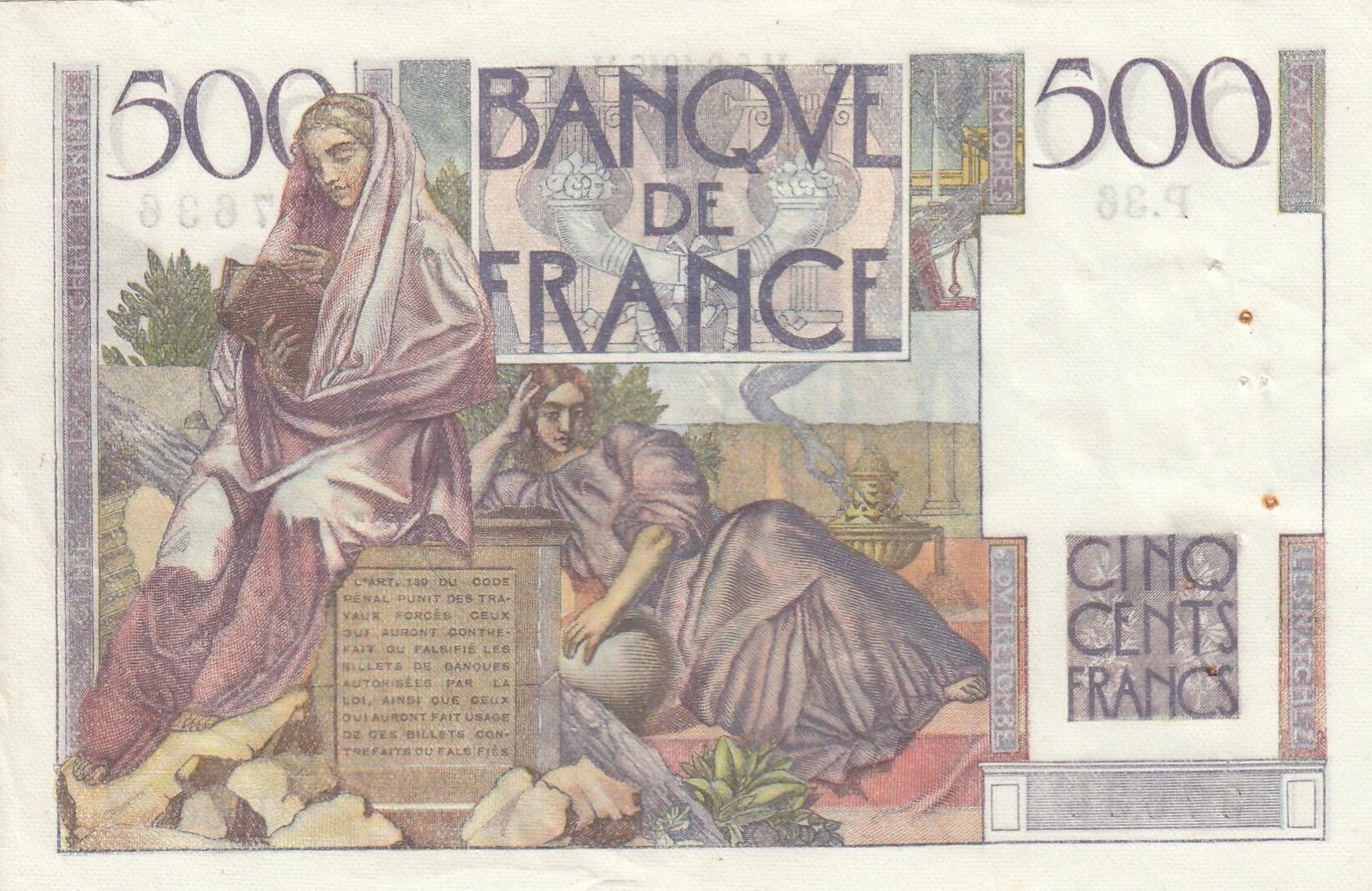 This banknote is issued by France and has a face value of 500 francs. It was put into circulation in 1945.