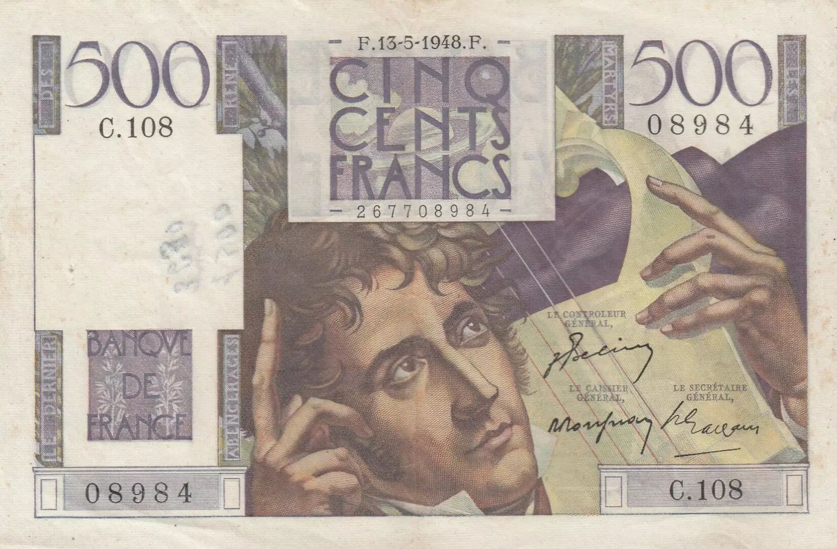 This French banknote with a face value of 500 francs was issued on May 13, 1948. The front of the banknote features a portrait of François René de Chateaubriand, holding a lyre, a plucked stringed musical instrument, a symbol of poetry and music. The inscriptions "500" are repeated on the sides, framing the value in words "CINQ CENTS FRANCS" (FIVE HUNDRED FRANCS) and the name of the issuing institution, "BANQUE DE FRANCE" (BANK OF FRANCE). The front is the work of engraver André Marliat and designer Robert Poughéon.