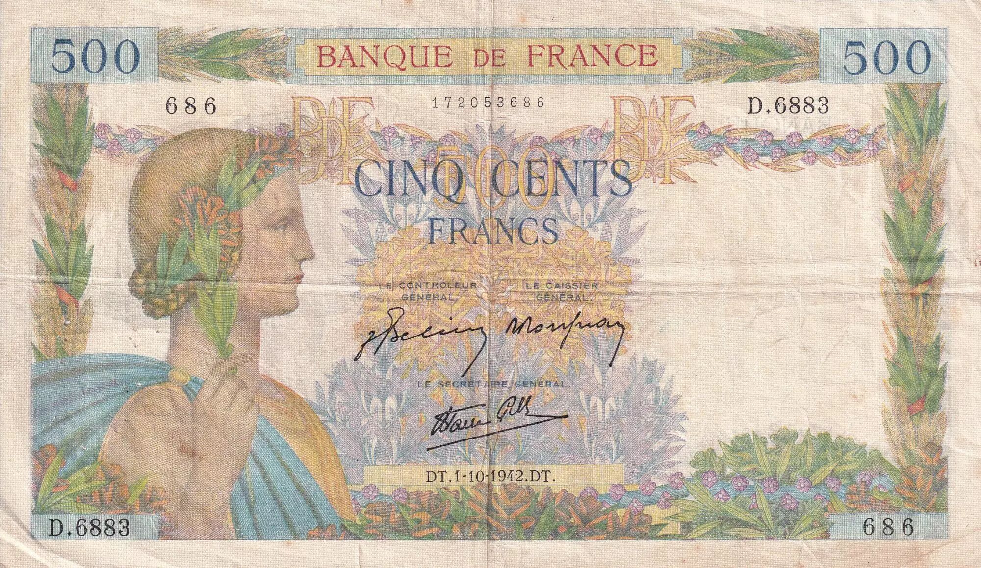 Banknote France 500 Francs La Paix - 01-10-1942 - Serial D.6883