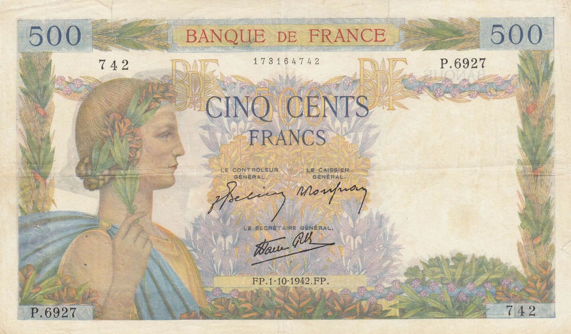 Le billet de 500 francs, émis le 1er octobre 1942, est une représentation fiduciaire de la valeur monétaire en France durant cette période. Ce billet s'inscrit dans la série P.6927.
