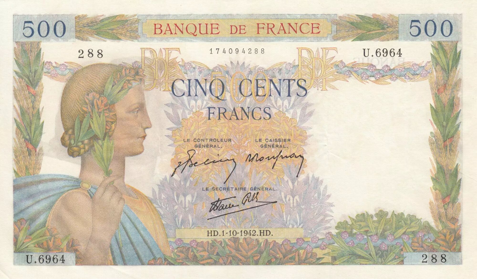 Accueil > Archivage > France 500 Francs La Paix - 01-10-1942 Série U.6964