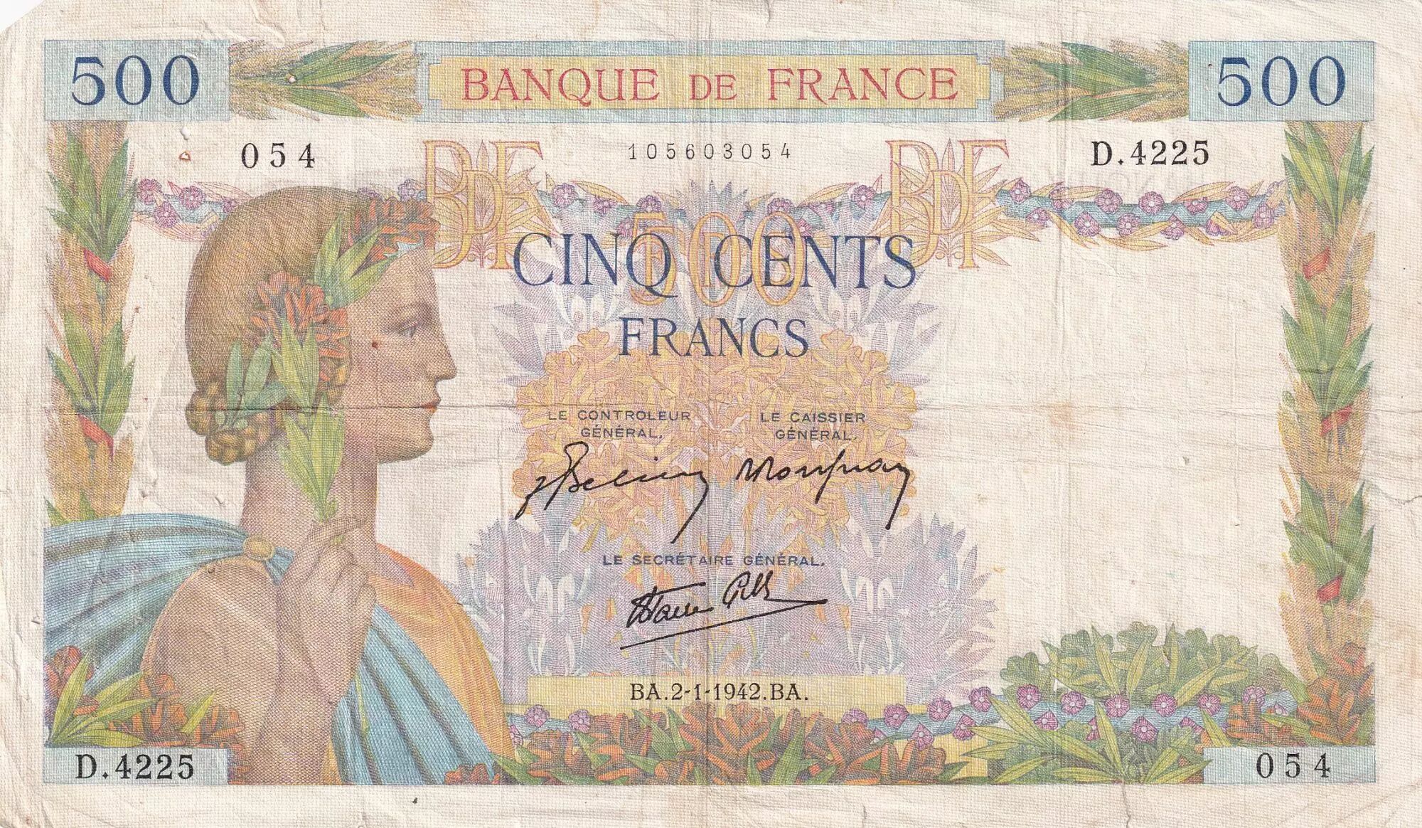 Banknote France 500 Francs La Paix - 02-01-1942 - Serial D.4225