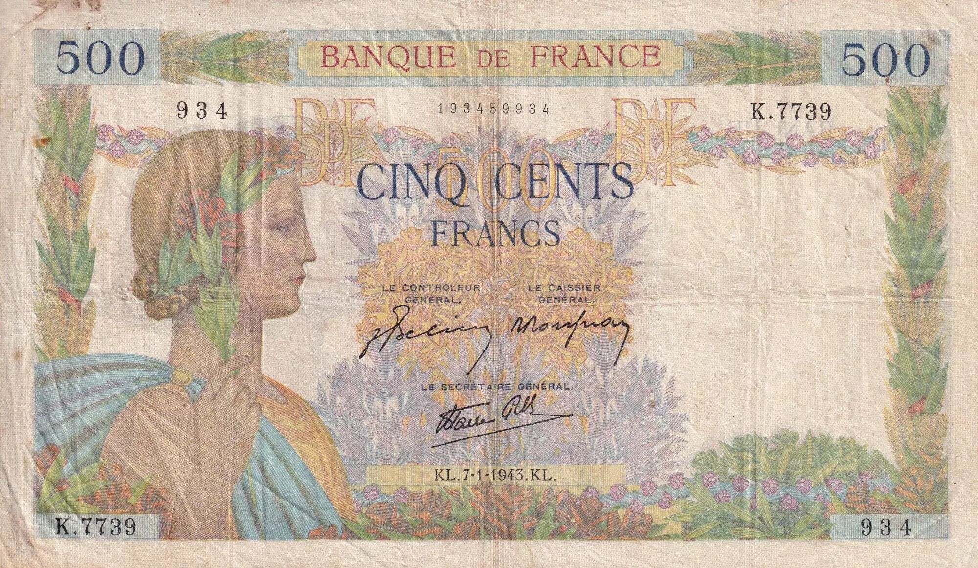 Accueil > Billets Français > Billets Banque de France > Billets 500 francs > La Paix type 1939 (1940-1945) > France 500 Francs - La Paix - 07-01-1943 - Série K.7739 - F.32.44
