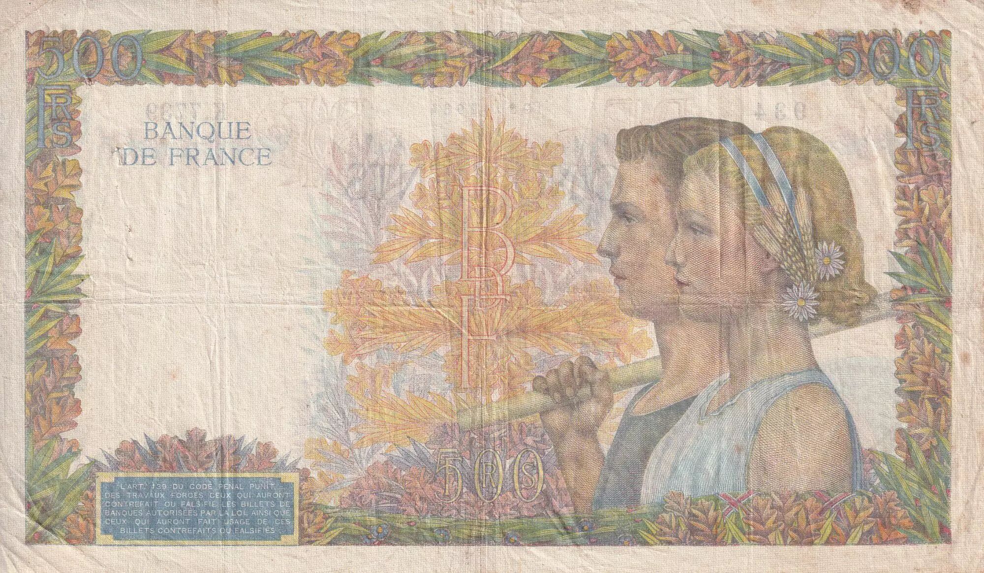 Billet France 500 Francs - La Paix - 07-01-1943 - Série K.7739 - F.32.44