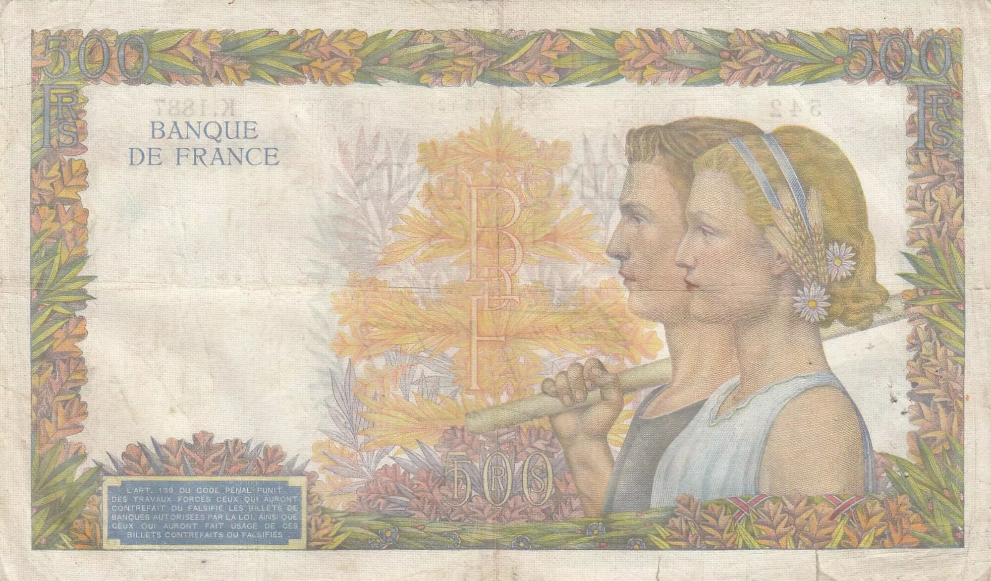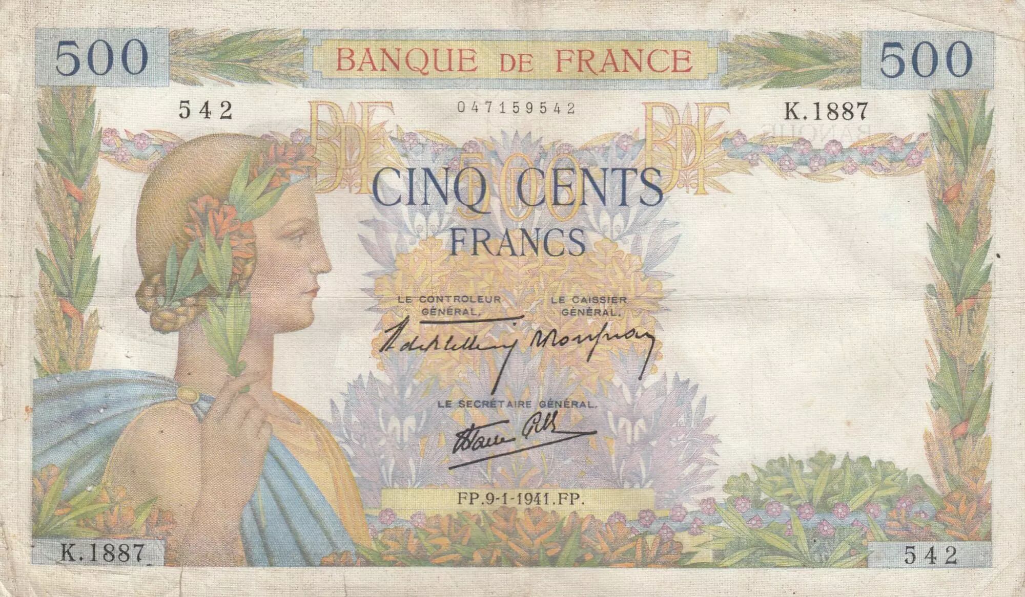 Billet France 500 francs - La Paix - 09-01-1941 - Série K.1887