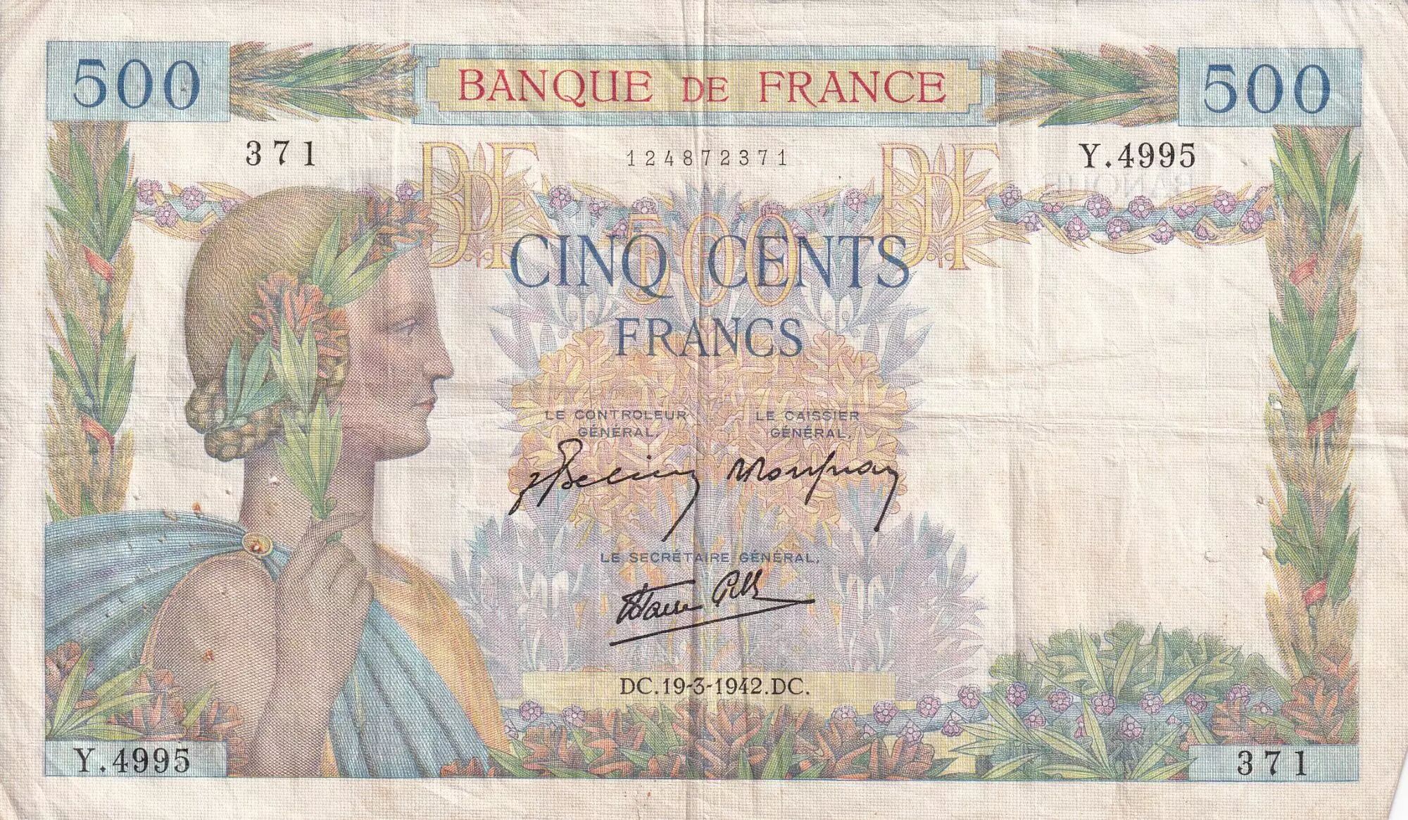 Banknote France 500 Francs La Paix - 13-03-1942 - Serial Y.4995