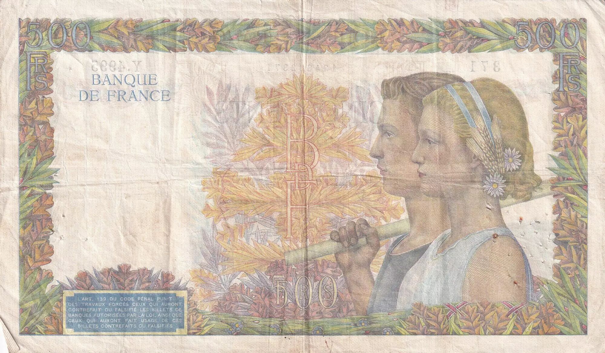 Accueil > Archivage > France 500 Francs La Paix - 13-03-1942 - Série Y.4995