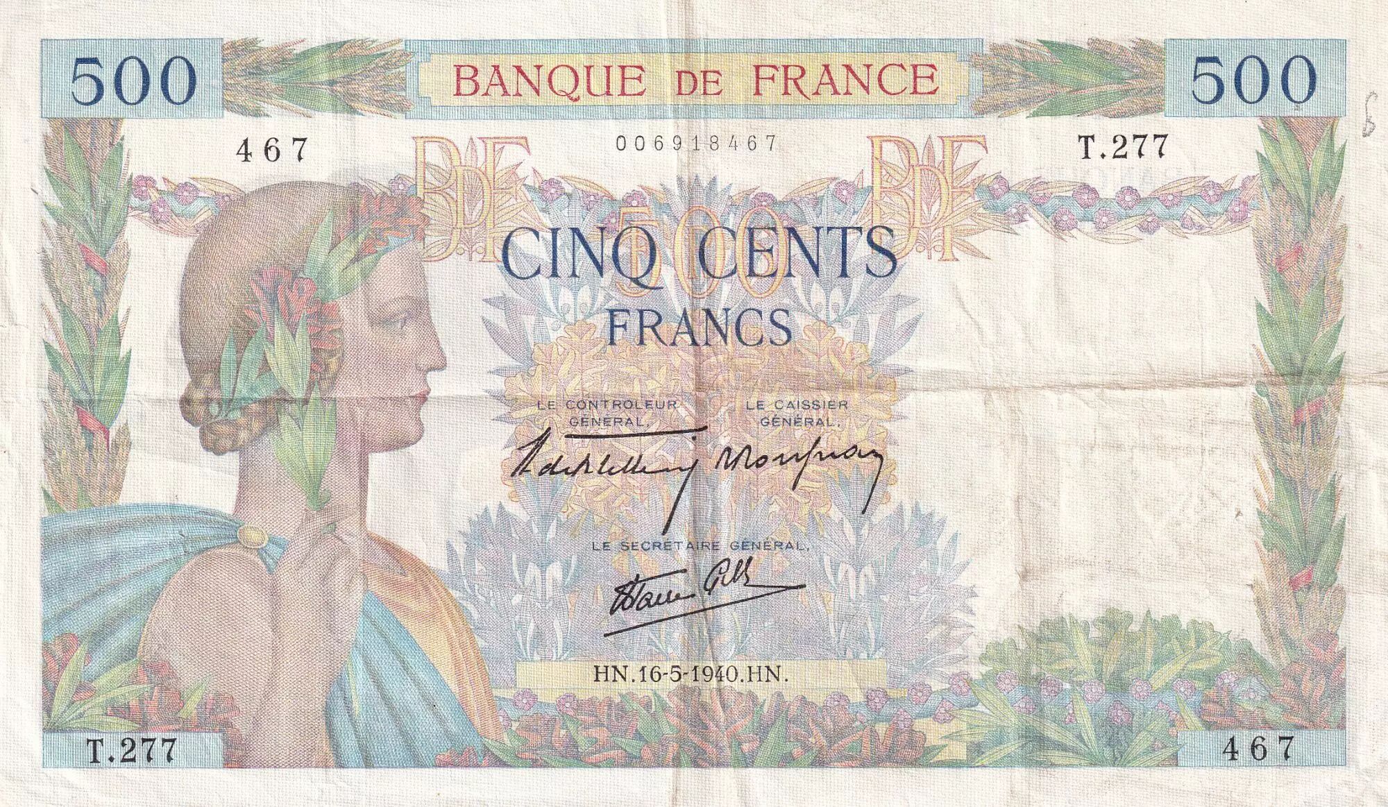 Banknote France 500 Francs - La Paix - 16-05-1940 - Serial T.277 - P.95