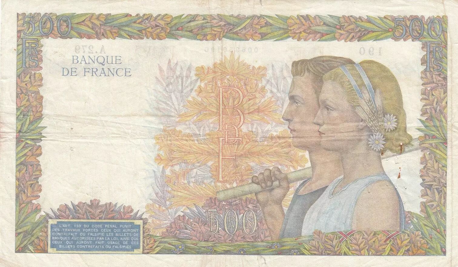 Billet France 500 francs - La Paix - 16-05-1940 - Série A.279