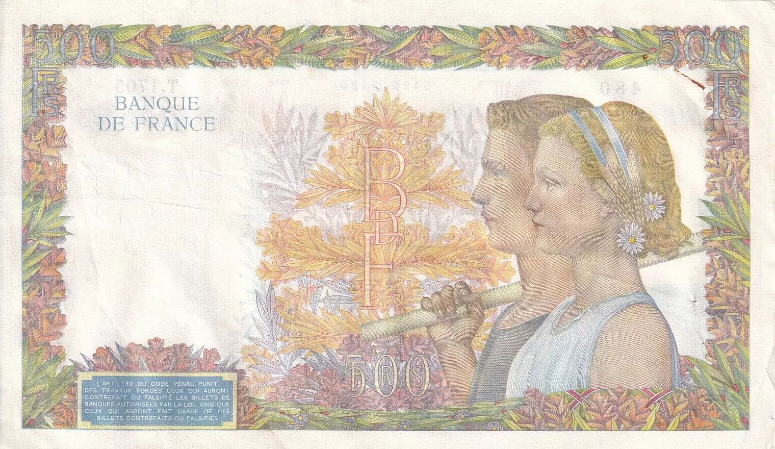 Accueil > Archivage > archivage-Billets Français > France 500 Francs La Paix - 19-12-1940 Série T.1705