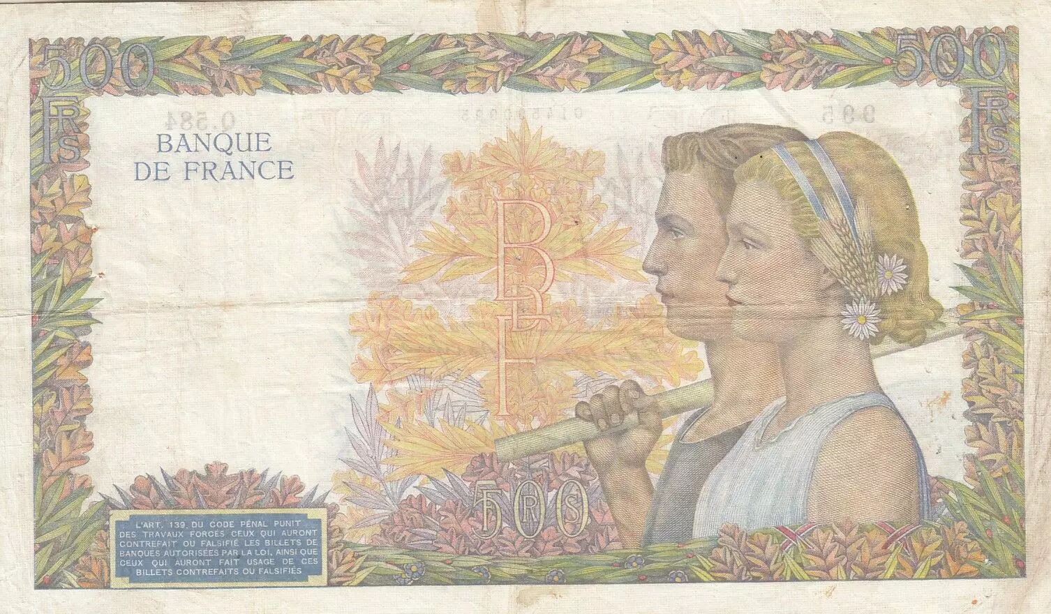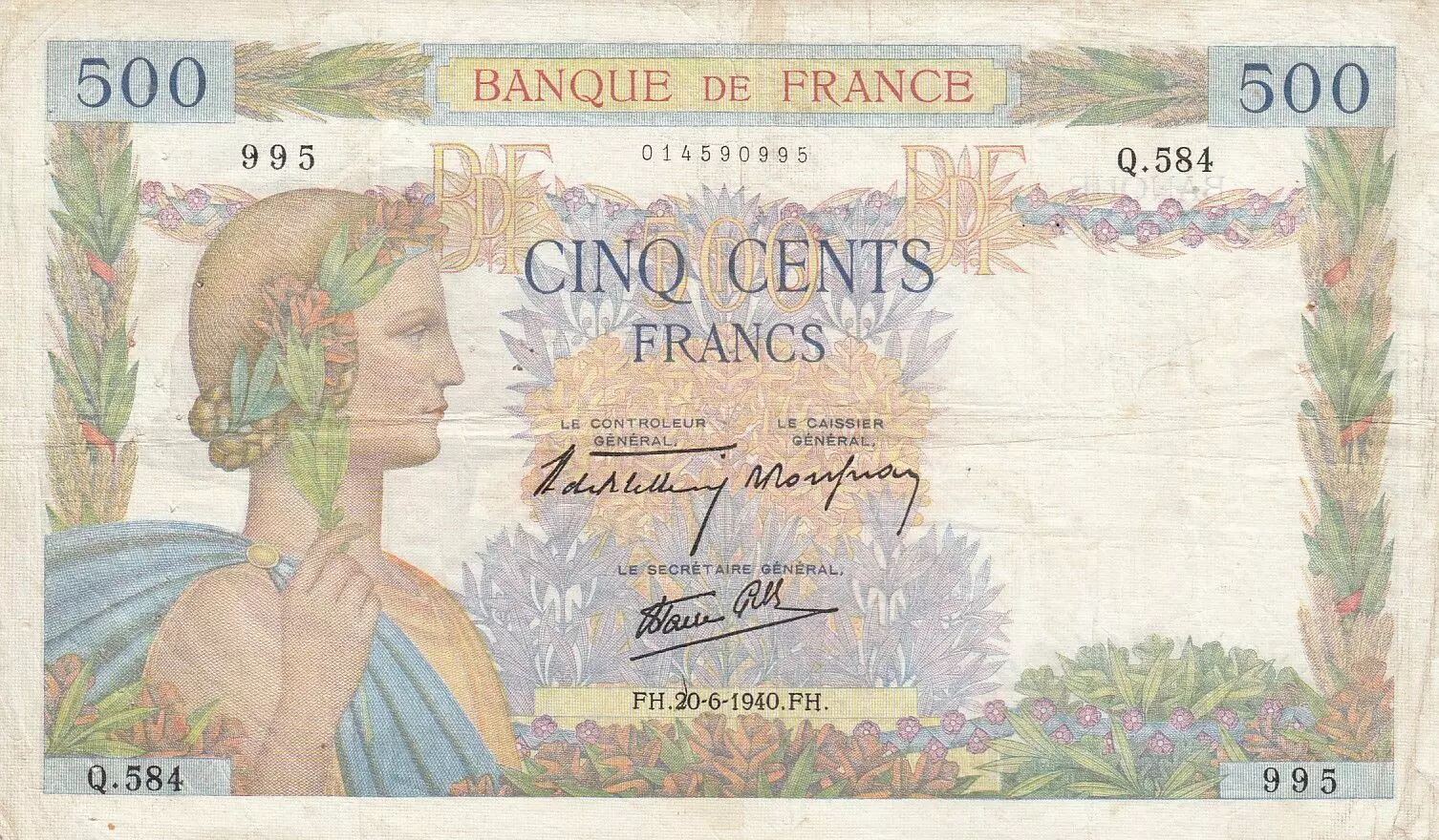 Billet France 500 francs - La Paix - 20-06-1940 - Série Q.584