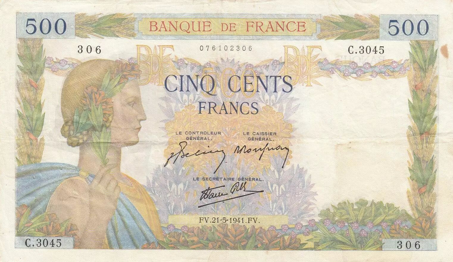 Banknote France 500 Francs - La Paix - 21-05-1941 - Serial C.3045