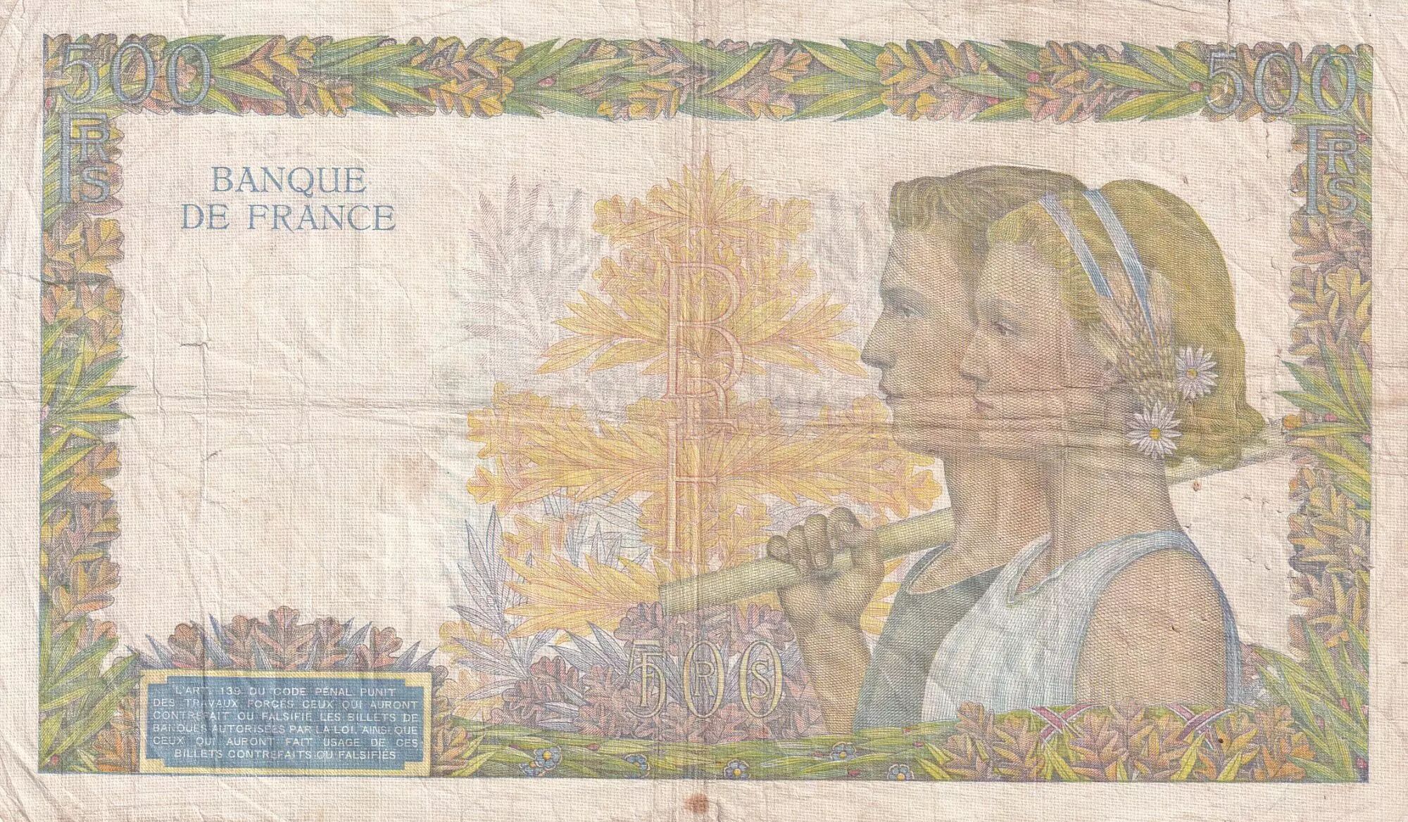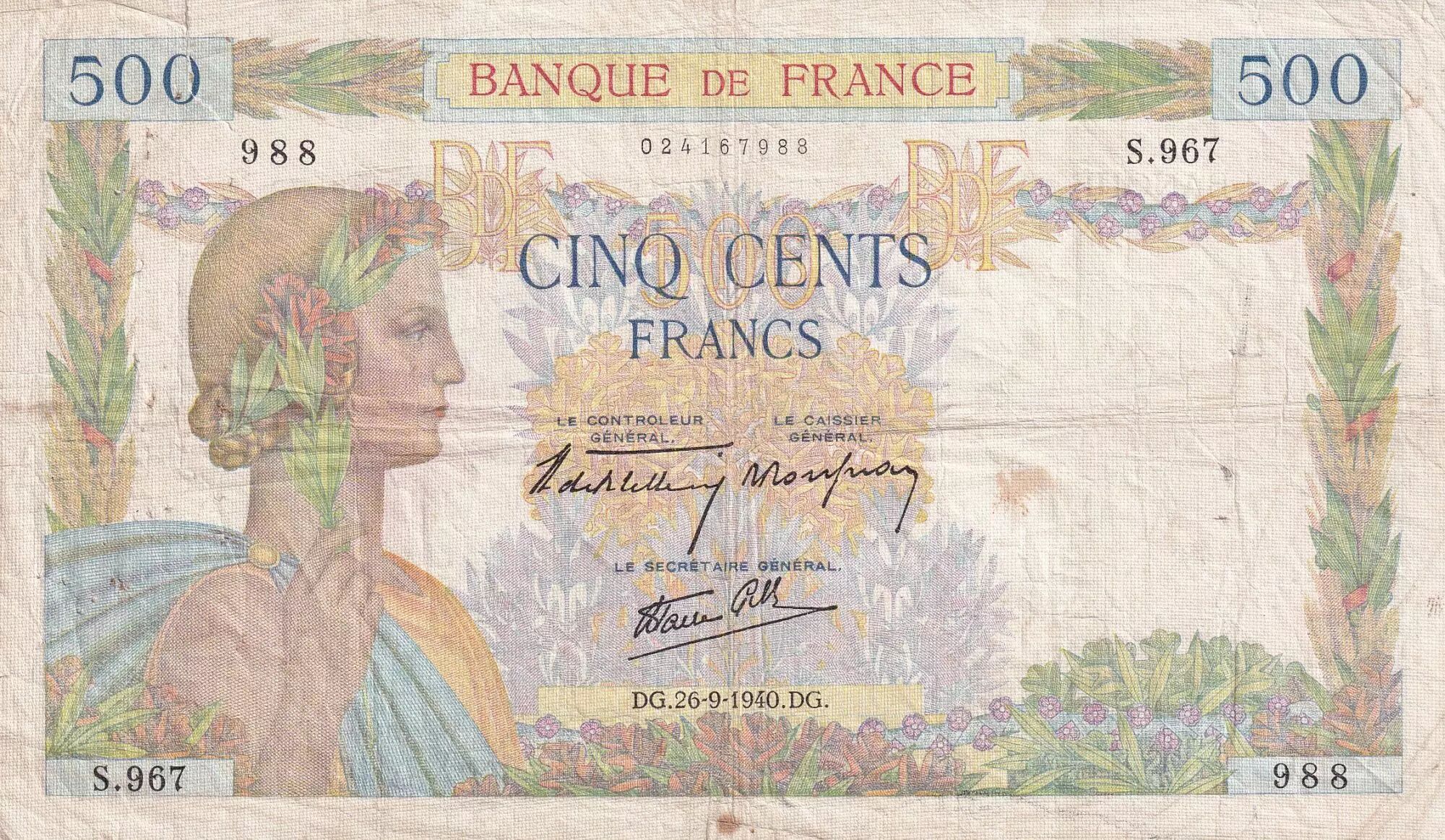 Banknote France 500 Francs La Paix - 26-09-1940 - Serial S.967