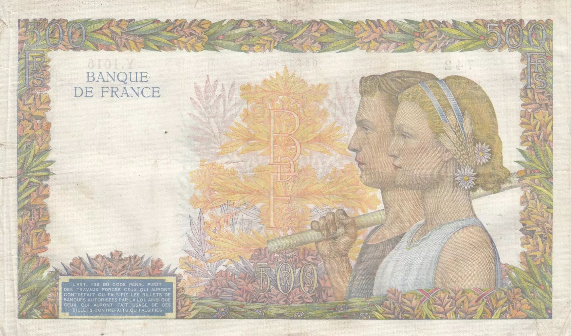Accueil > Archivage > archivage-Billets Français > France 500 francs - La Paix - 26-09-1940 - Série Y.1016