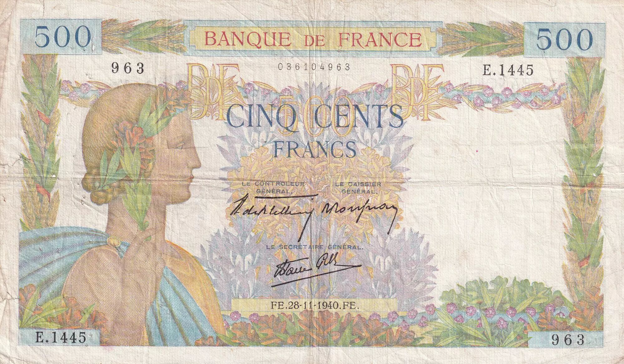 Accueil > Archivage > France 500 Francs - La Paix - 28-11-1940 - Série E.1445 - F.32.09