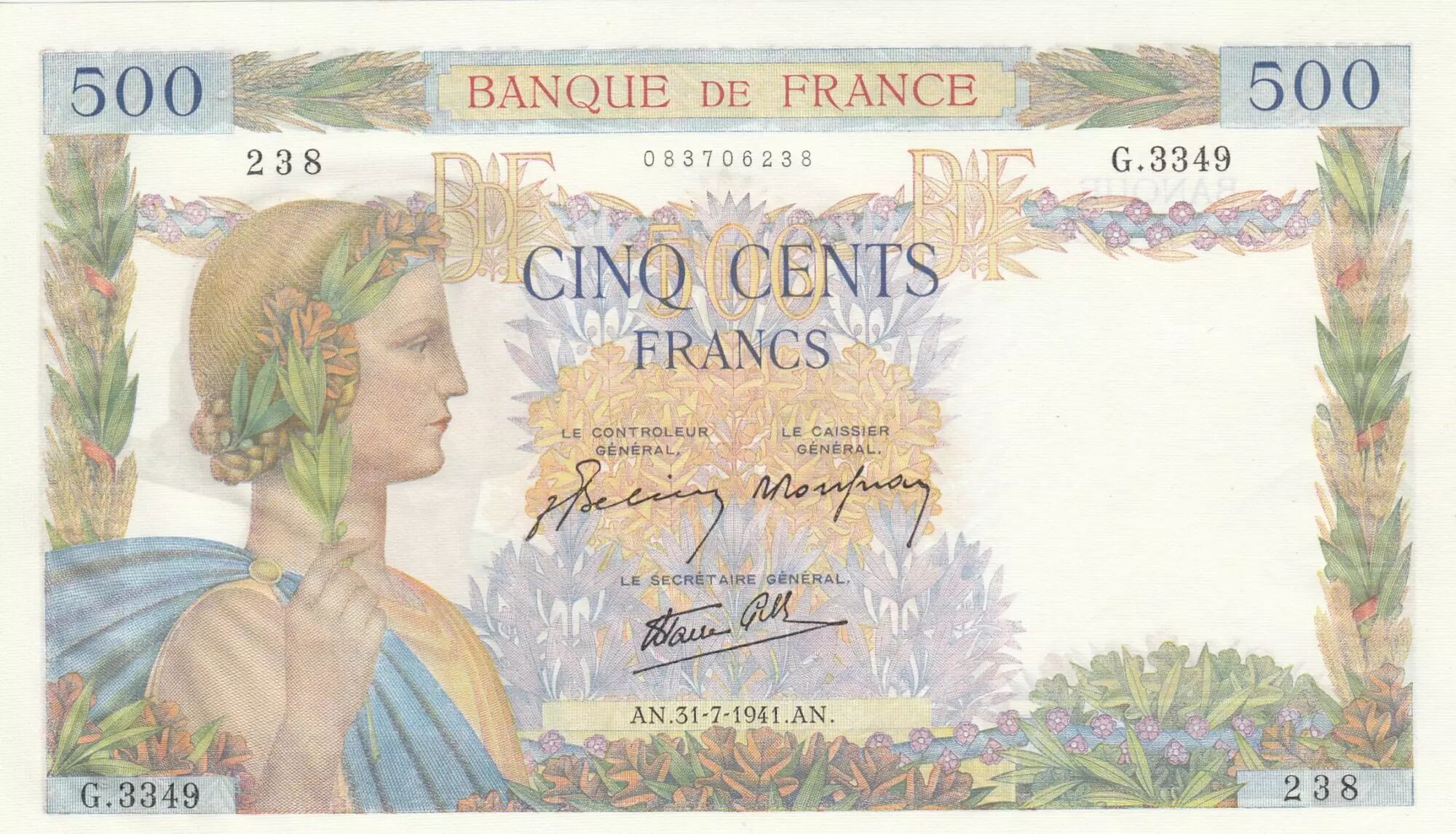 Le billet de 500 Francs, émis le 31 juillet 1941, appartient à la série G.3349. Il représente une valeur nominale de 500 francs et a été émis en France.