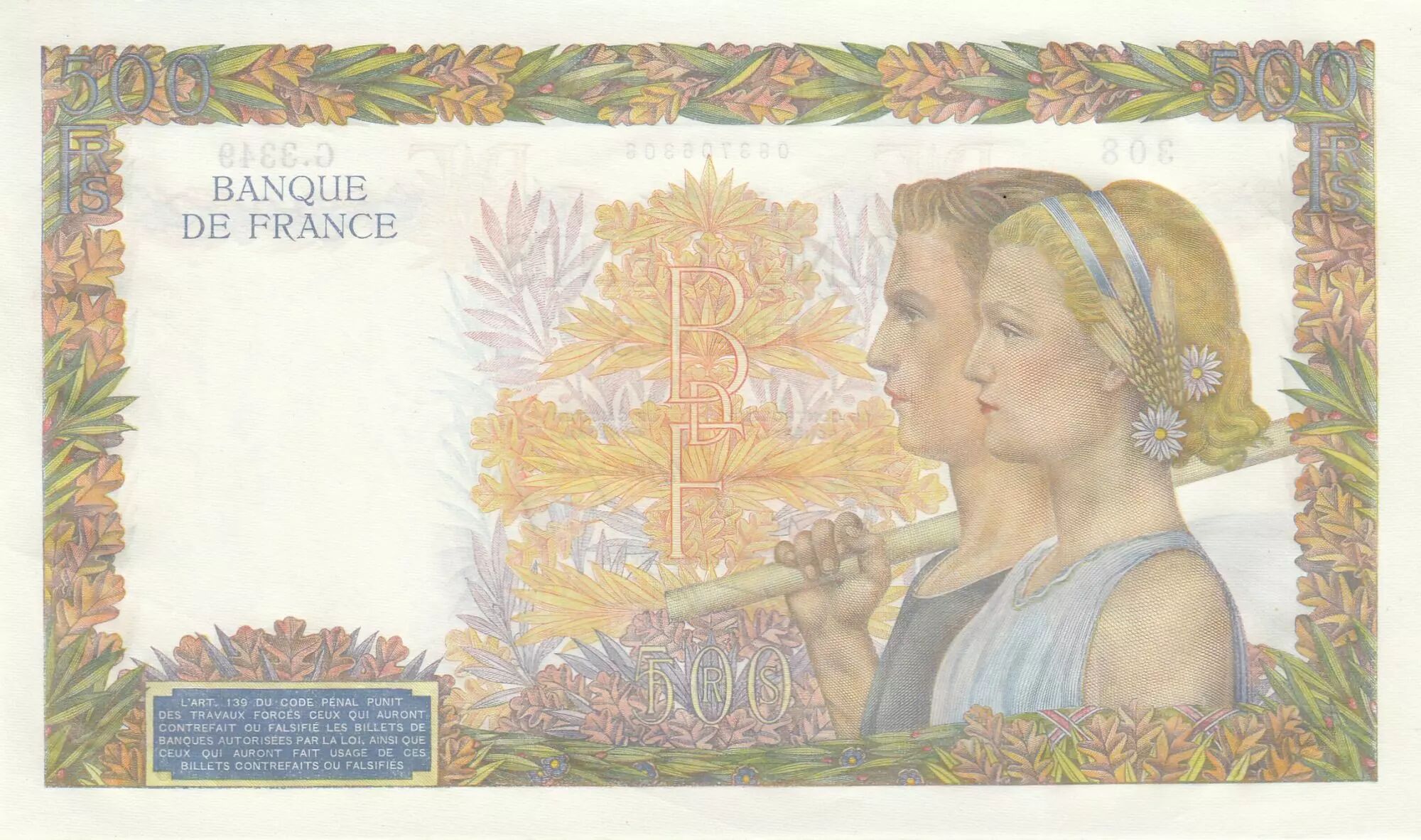 La valeur nominale de ce billet est de 500 francs, une somme importante à l'époque de son émission. Il représente un instrument d'échange et un symbole de la valeur économique en France pendant cette période.