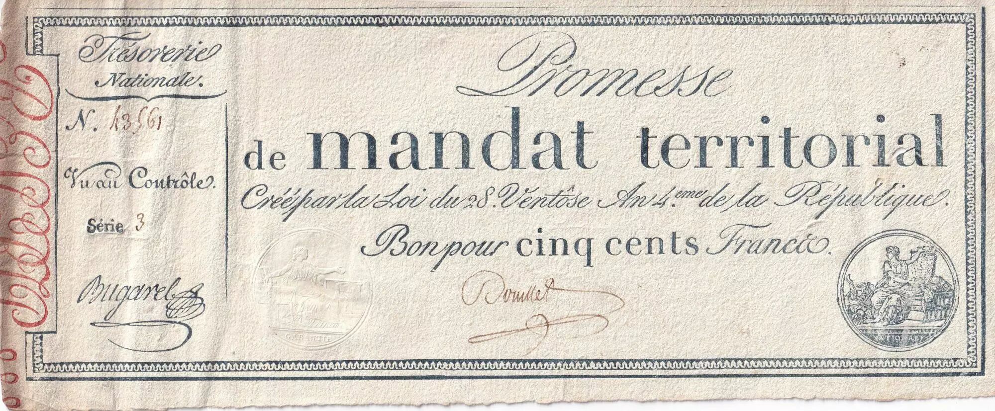 Accueil > Archivage > France 500 Francs - Mandat Territorial avec série - 1796 - TTB+