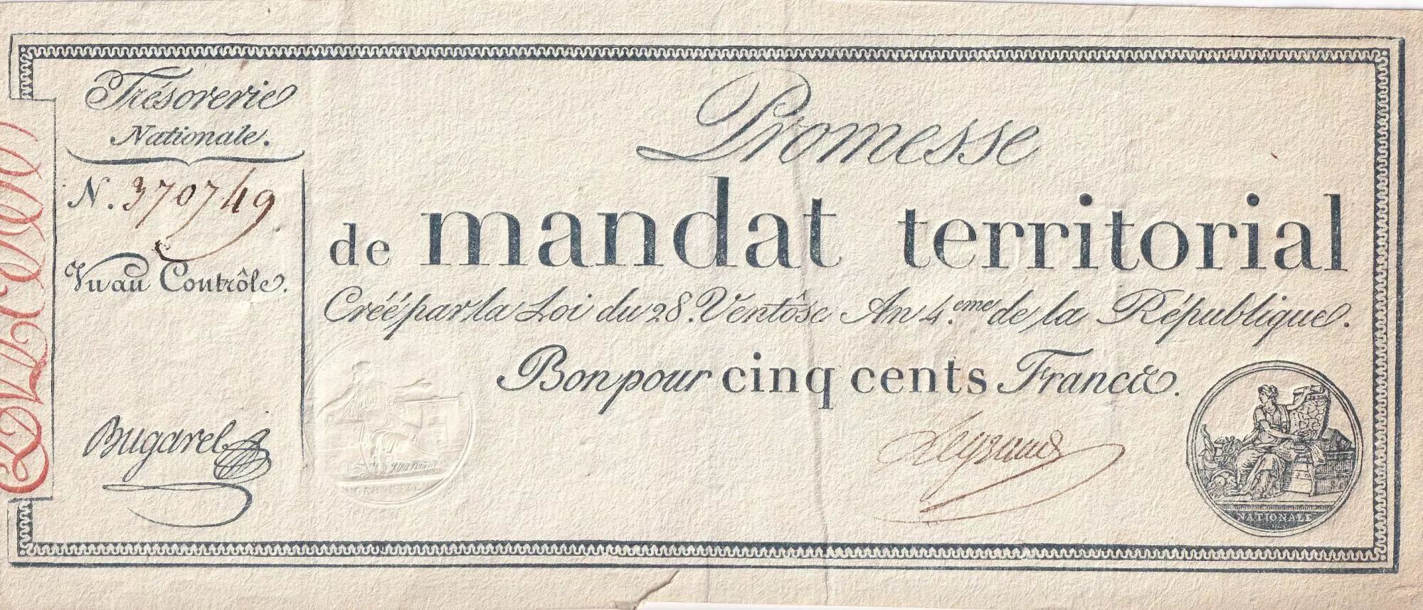 Accueil > Archivage > France 500 Francs - Mandat Territorial sans série - 1796 - TTB+