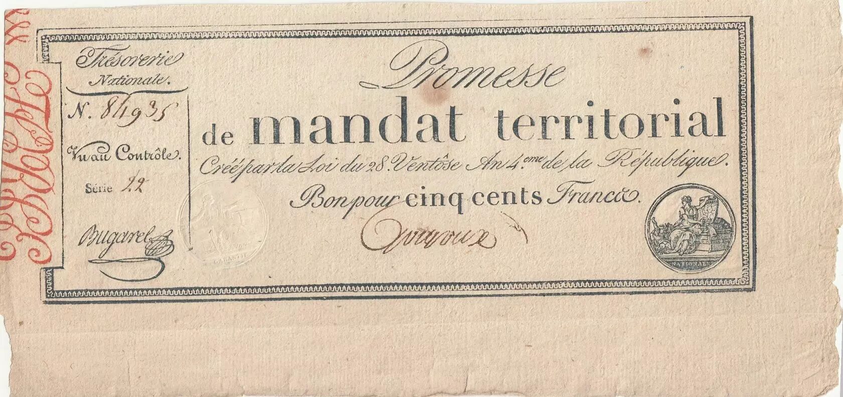 Billet France 500 Francs - Mandat Territorial - Série 22 - Num 84935 - 1796